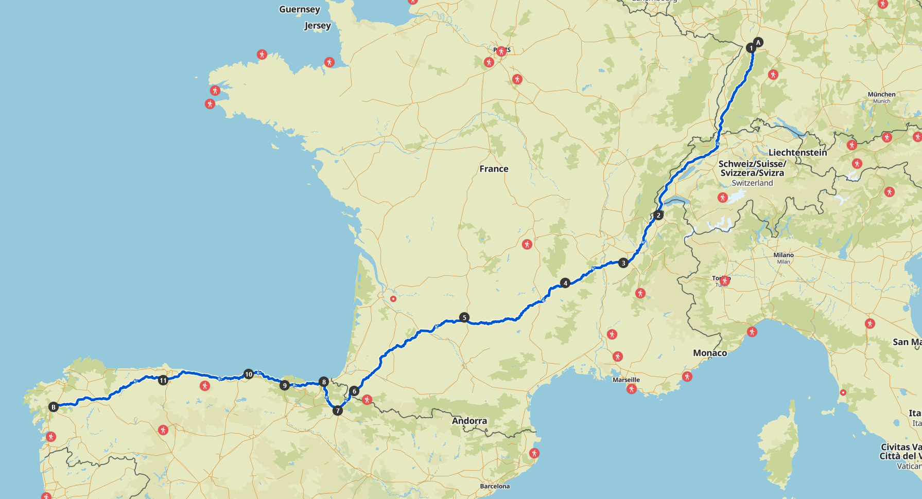 Mein erstes größeres Ziel in Frankreich ist Le Puy-en Valey in der Auvergne. Dort beginnt dann auch der bekannte Jakobsweg „Via Podiensis“. Diesem Weg werde ich dann für die nächsten paar hundert Kilometer folgen. Bevor ich auf die Pyrenäen treffe, werde ich den Ort Saint-Jean-Pied-de-Port erreichen, welcher als Ausgangspunkt für die meisten Pilger auf dem Jakobsweg genutzt wird.