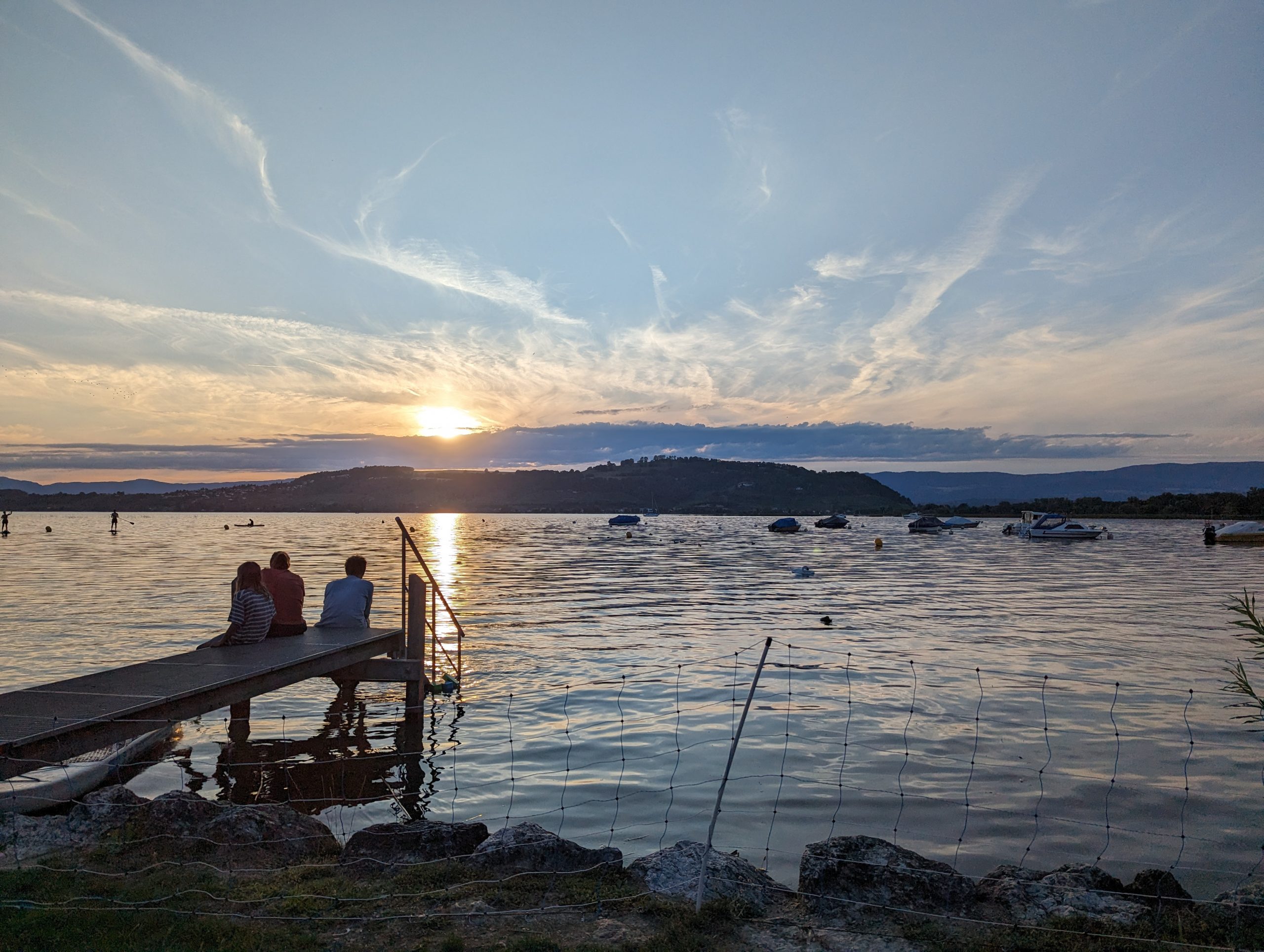 Nach einiger Zeit bekam ich leichte Schmerzen im unteren Schienbein des rechten Fußes. Ich band meine Schuhe neu und machte eine kleine Pause. Leider wurden die Schmerzen aber immer schlimmer und ich humpelte ein wenig. Daher beschloss ich den nächstmöglichen Campingplatz anzulaufen und mich dort zu erholen, um Schlimmeres zu verhindern. Nachdem ich mir einen Platz auf dem Campingplatz im knapp 3km entfernten Muntelier gesichert hatte, humpelte ich wieder los.