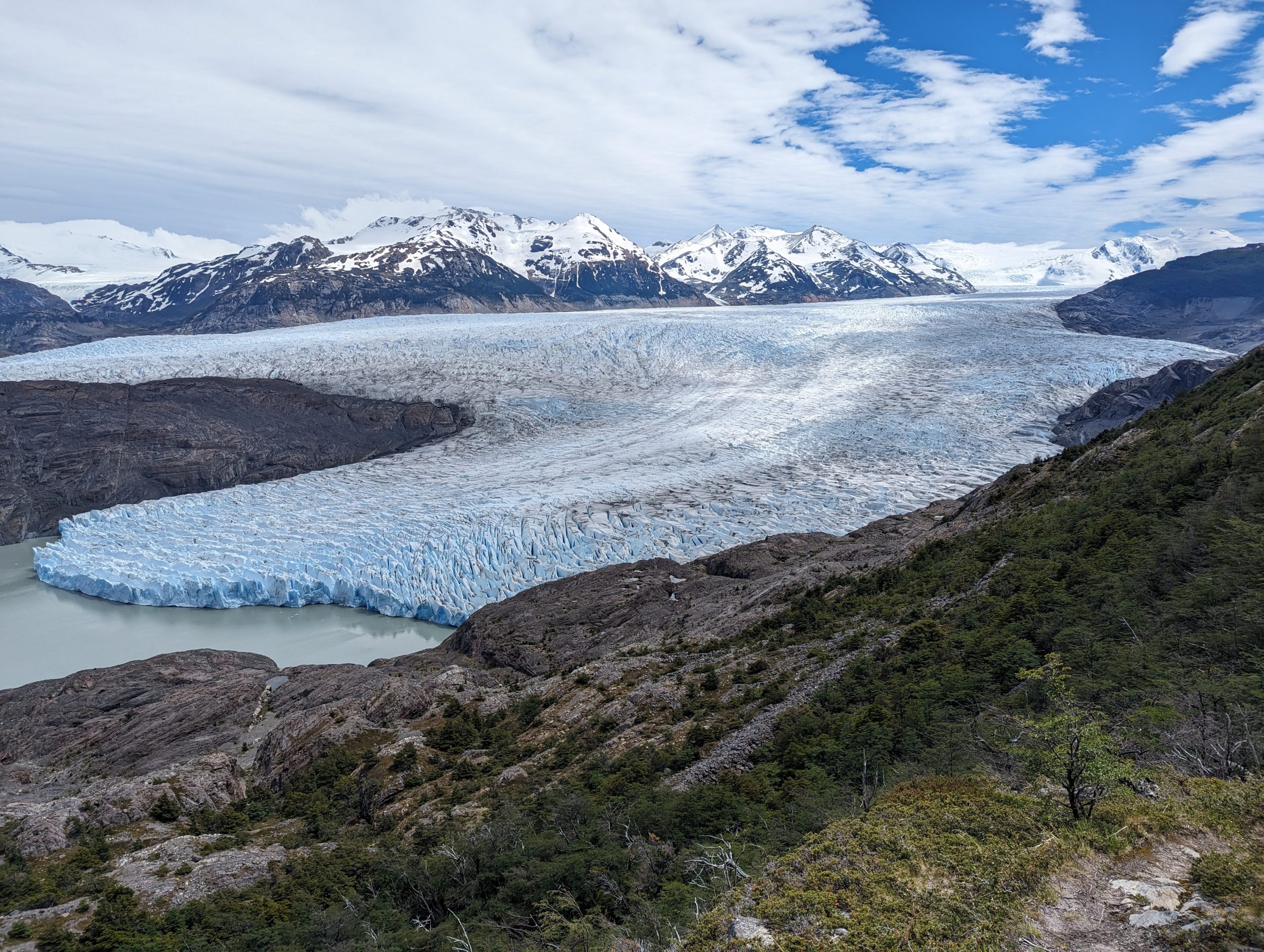 Auf der Innenseite stiegen wir zu einem Aussichtspunkt ab und betrachteten uns für einige Minuten den See mit dem dahinter liegenden Gletscher, was wie immer ein schöner Anblick war.