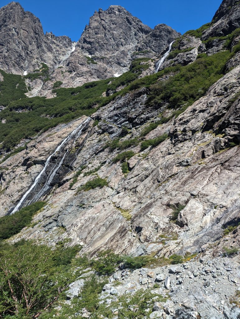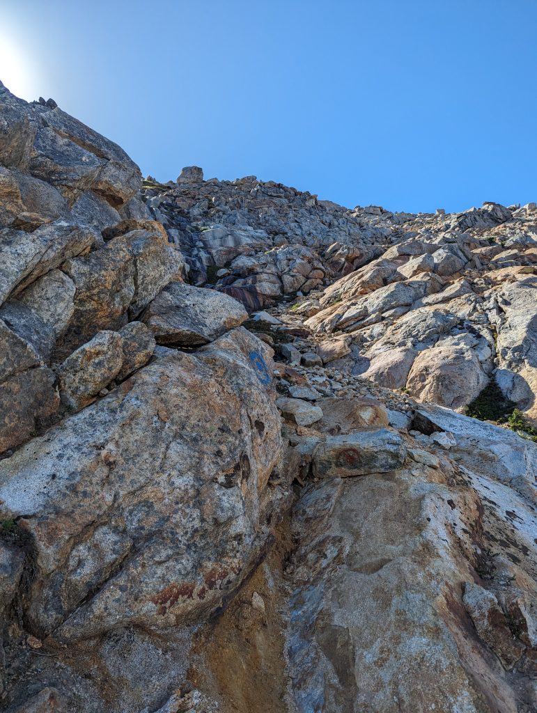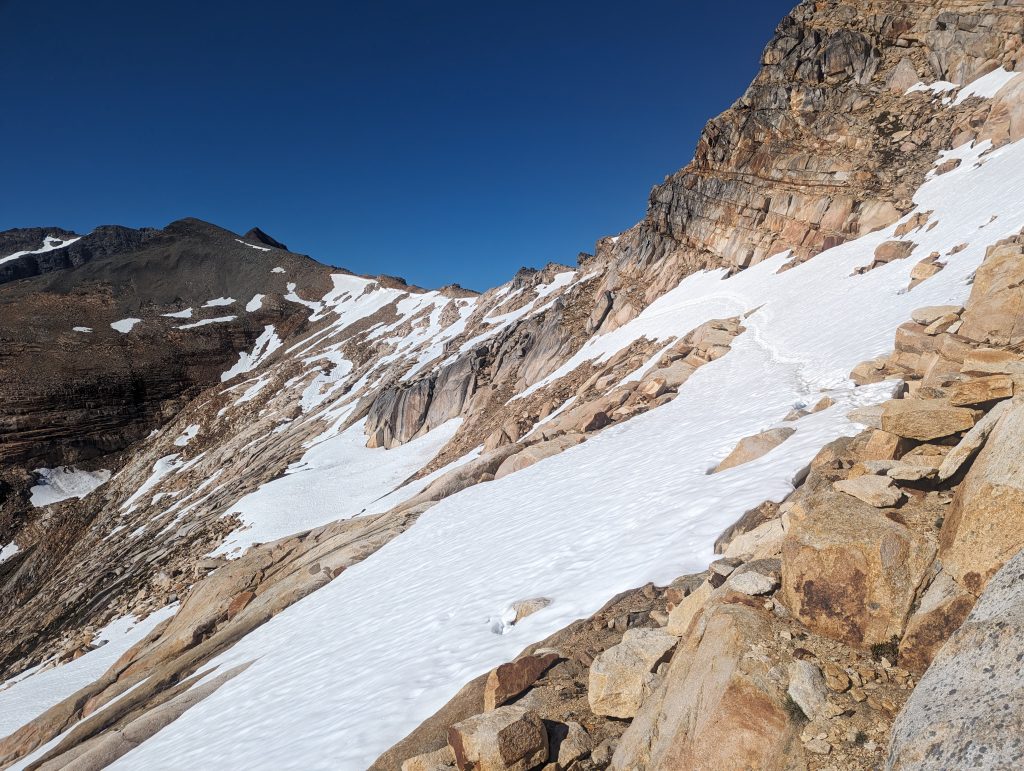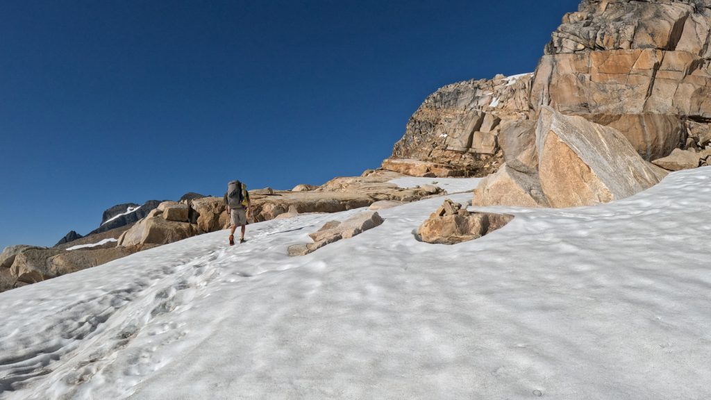 Auf der anderen Seite folgte dann ein etwas kompliziertere Abstieg. Teilweise kletterte ich die steilen Felswände hinunter, was mit dem schweren Rucksack nicht so einfach war. Zwischendrin folgten auch hier immer wieder Schneefelder, die aber immerhin ziemlich einfach zu durchqueren waren.