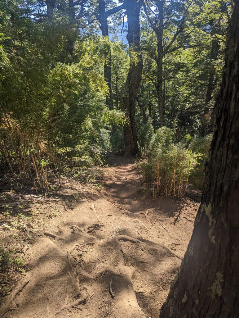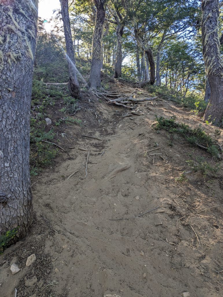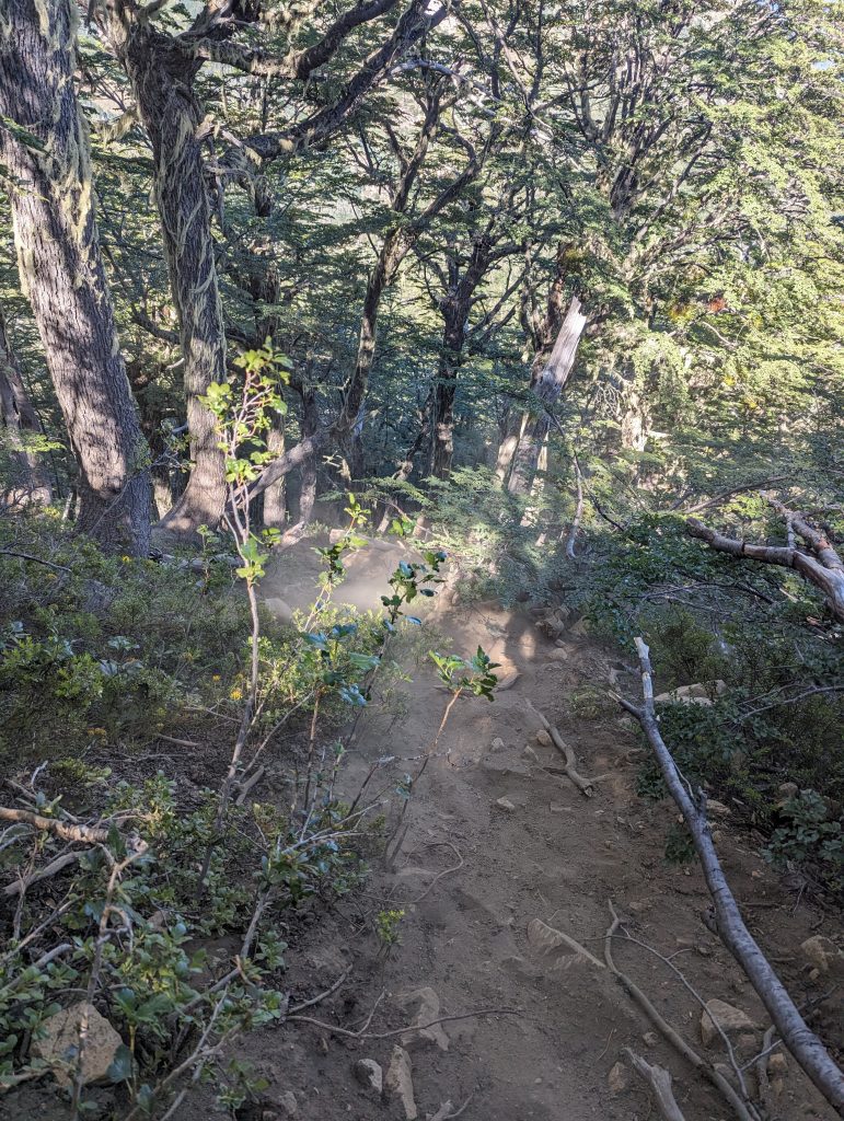 Es folgte zuerst ein kurzer Abstieg durch ein Geröllfeld und weiter unten kam dann einen sehr steiler und sandiger Waldpfad auf mich zu. Generell war der Weg zwar gut zu laufen, aber immer wieder bekam ich den feinen Sand in meine Schuhe und bald fühlte es sich so an, als ob der ganze Schuh voller Sand wäre.