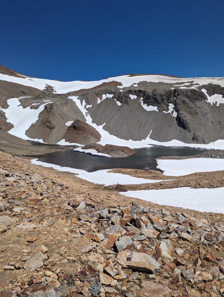 Nach einiger Zeit kam ich immerhin an einem kleinen Bachlauf vorbei, an dem ich sowohl mein Wasser auffüllen, als auch ein paar schattigere Plätze vorfand. Hier folgte ich dem Bachlauf immer weiter nach oben, ehe ich dann endlich den nächsten See erreichte.