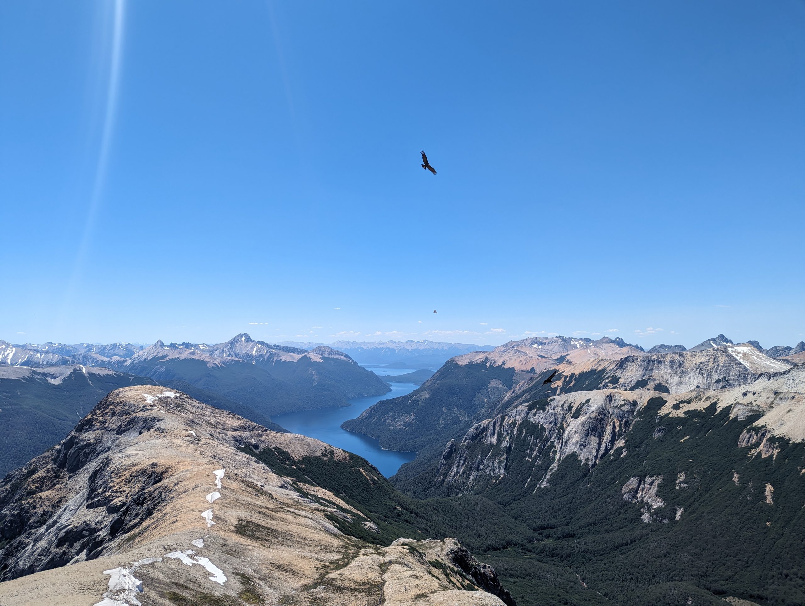 Da es gerade Mittagszeit war, entschied ich mich hier meine Mittagspause einzulegen und mir dabei die schönen Seen und Berge der Region zu betrachten. Während ich mein Salamibrot verspeiste und dabei die schöne Landschaft genoss, kreisten direkt über mir dann noch einige Andenkondore, welche mit einer Spannweite von knapp 3 Metern und einem Gewicht von etwa 15 Kilogramm zu den größten Greifvögeln der Welt gehören und ein sehr beeindruckendes Naturerlebnis boten. Die rießigen Greifvögel in der freien Wildbahn zu erleben, machten die Mittagspause zu einem echten Highlight auf der Tour.