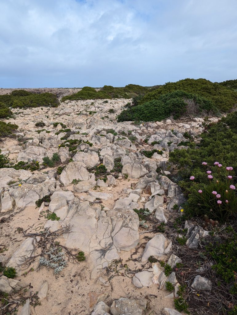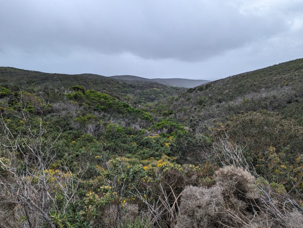 Nachdem ich das heiße Getränk eine Weile genossen hatte, packte ich alles wieder ein und lief weiter. Es ging wieder häufig auf und ab. Mal stand ich auf den Klippen ganz oben, mal fand ich mich selber wieder irgendwie im Gebüsch ganz unten. Da mich der offizielle Weg die meiste Zeit etwas weiter hinten lang geführt hätte, lief ich kleinere inoffizielle Pfade direkt an der Steilküste entlang. Dies führte dazu, dass ich noch häufiger hoch und runter durfte und somit hatte ich schon bald die ersten 500 Höhenmeter des Tages absolviert, obwohl ich noch nicht so lange unterwegs war.