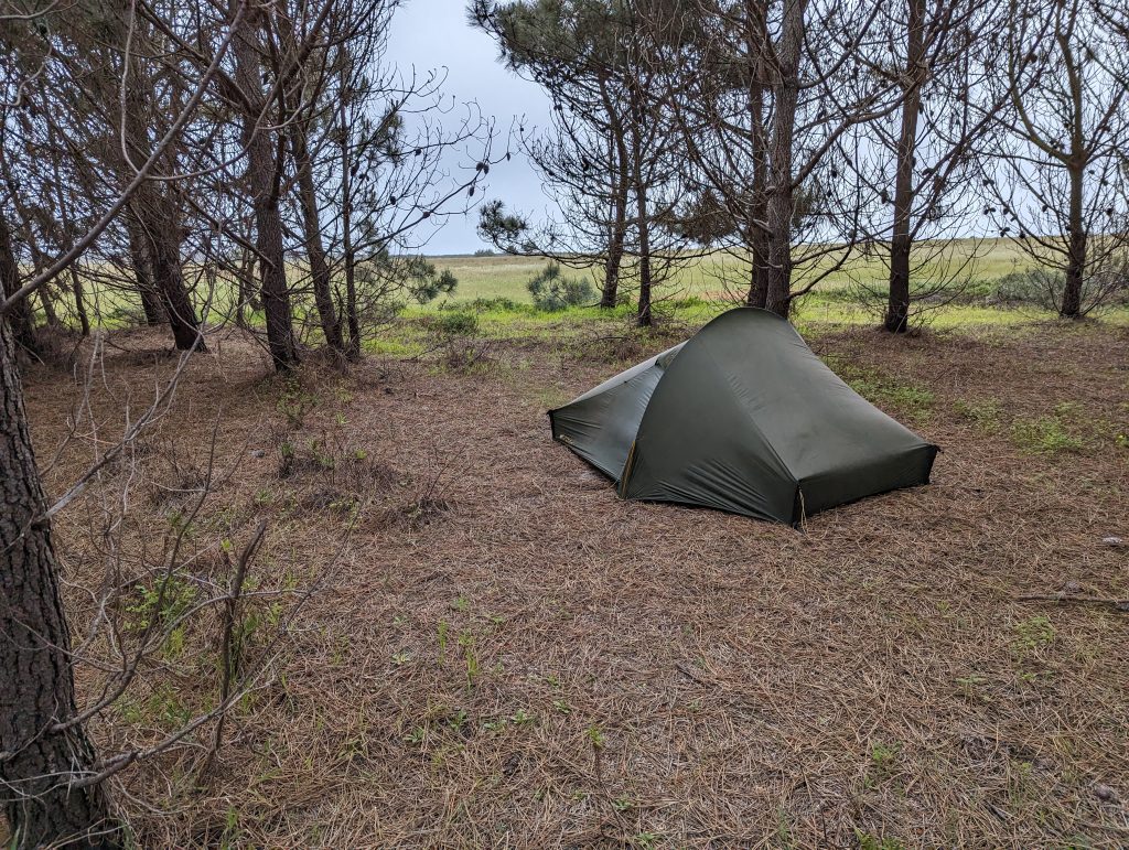 Etwas abseits des Weges finde ich am Rande eines Waldes einen guten Platz. Dort stehen die Bäume etwas weiter auseinander und somit war noch Platz für mein Zelt. Wie ich schnell feststellte, gab es einige Meter weiter eine alte Feuerstelle, was mich darauf zurückschließen ließ, dass hier bereits andere mit dem Zelt übernachtet hatten.