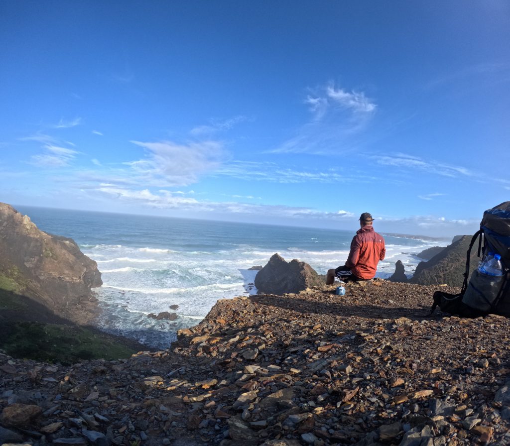 Nach einigen Kilometern traf ich dann aber schon wieder auf das Meer. Als dann auch noch hinter mir die Sonne durch die Wolkendecke brach und es schnell richtig warm wurde, setze ich mich auf einen der Felsen direkt am Wegesrand und machte mir meinen morgendlichen Kaffee bei bester Aussicht.