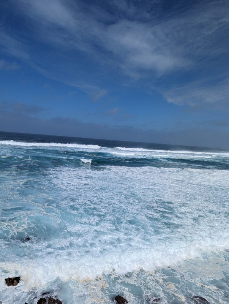 Aufgrund des wirklich starken Windes, bei dem ich öfters aufpassen musste nicht umgeweht zu werden, waren die Wellen auf dem Meer heute besonders hoch. Es war interessant anzuschauen, wie die großen Wellen mit voller Wucht auf die Küste trafen. Teilweise wurde das Wasser bis über die Kante der Felsen geworfen, was wirklich faszinierend aussah.