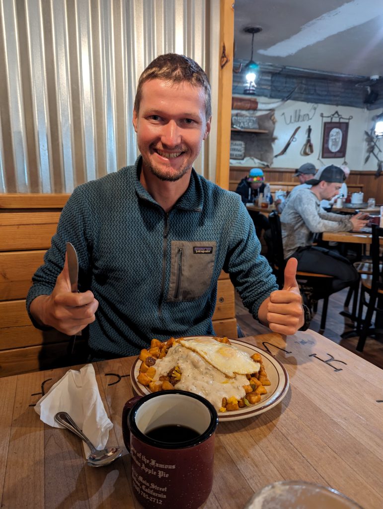 Als ich pünktlich um 8 Uhr zur Öffnungszeit ankomme, treffe ich direkt auf einige Hikern, die ich bereits kenne und die gestern noch bis zum Cafe gelaufen sind, um unter dem Dach zu übernachten. Die bemitleiden mich ziemlich, dass ich bei diesem Sturm im Zelt übernachten und dann heute morgen hier her laufen musste. Immerhin öffnet das Café direkt und ich sitze mit den anderen am Tisch und wärme meine Hände an der warmen Kaffeetasse auf. Dann gibt es noch ein leckeres Spinat-Feta-Omlett. Während dem ausgiebigen Frühstück unterhalten wir uns über verschiedene Themen, wie den weiteren Plänen und der bisherigen Strecke. Es werden aber auch ernstere Themen, wie etwa die Post-Trail-Depression und Breakdowns während dem Wandern, diskutiert.