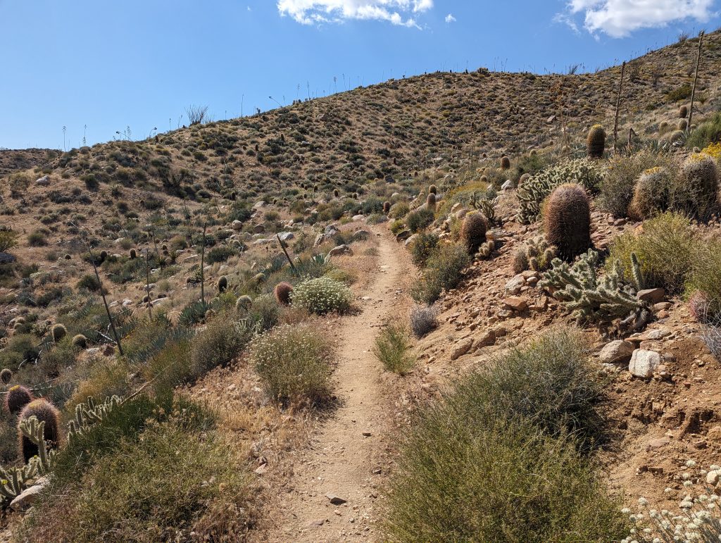 Nachdem ich gegen halb 12 dann bereits einen großen Teil meiner Strecke geschafft habe, lege ich mich etwas in den Schatten eines Busches und ruhe mich aus. Danach geht es in der mittlerweile heißen Sonne wieder weiter. Immerhin weht ein bisschen Wind, was das Laufen angenehmer macht. Während ich durch die Gegend wandere, betrachte ich mir die vielen verschiedenen Kakteen und einige Tiere, die ich auch heute antreffe.