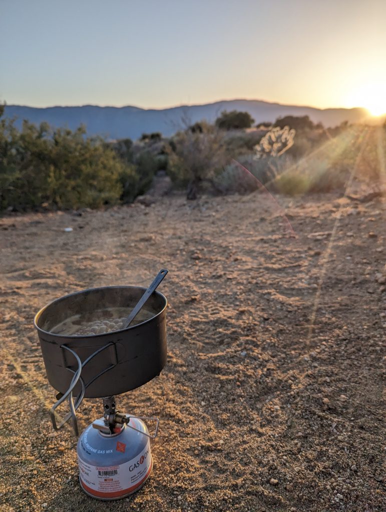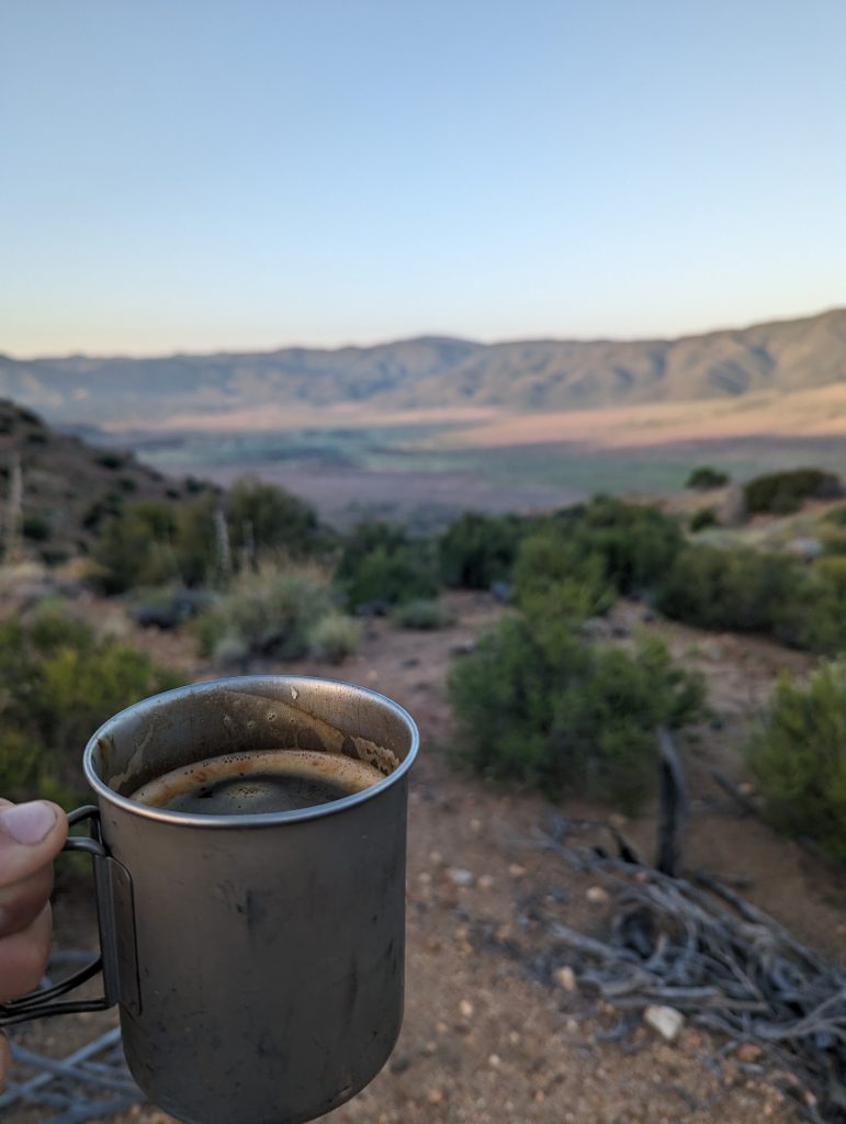 Der Wind war zum Glück in der Nacht ausgeblieben und insgesamt war es wärmer als erwartet. Pünktlich stehe ich auf, um mir noch den Sonnenaufgang bei einem Tasse Kaffee anzuschauen. Zum Essen habe ich leider nichts mehr, da mir die Haferflocken ausgegangen sind. Rich gesellt sich noch kurz zu mir, macht sich dann aber auch bald auf den Weg. Ich genieße noch meine warme Tasse Kaffee, bevor auch ich mein Zelt einpacken und wieder loslaufen.
