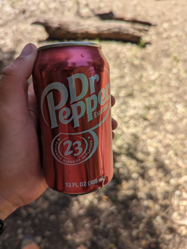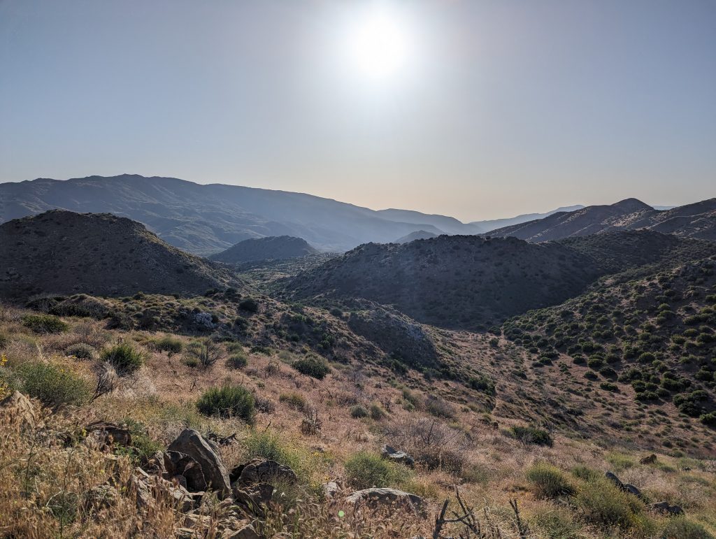 Nach einer kurzen Pause im Schatten folgt ein längerer Abstieg. Schon von weitem kann ich die Straße sehen, zu der ich hinunter muss. Immerhin ist das runter laufen bei diesen Temperaturen angenehmer als das Aufsteigen. Nach 25 km komme ich gegen 13 Uhr an einem Camp vorbei, bei dem es fließendes Wasser aus einer Tränke gibt. Dort lege ich mich direkt für einige Minuten in den Schatten und mache einen kurzen Mittagsschlaf, um die Beine auszuruhen. Danach unterhalten ich mich mit zwei Hikern, die auch gerade hier sind. Überraschenderweise kommt dann noch ein Mann vorbei und fragt uns, ob wir etwas zum Trinken oder essen wollen. Er habe einiges für Hiker dabei und verbringe heute den ganzen Tag hier, um den Leuten eine kleine Abkühlung zu geben.Kurze Zeit später sitzen wir mit Gemüse (Paprika, Gurke, Tomate), Colas und Milchreis im Schatten und freuen uns über das gute Essen. Nach so langer Zeit in der heißen Sonne, schmeckt alles besonders gut.