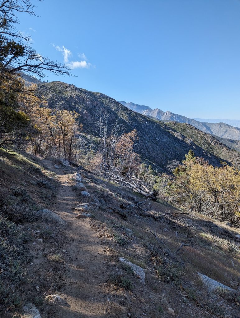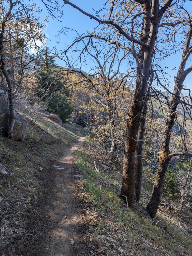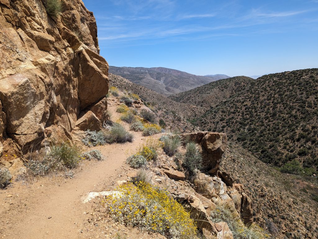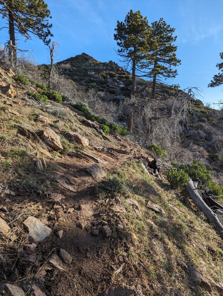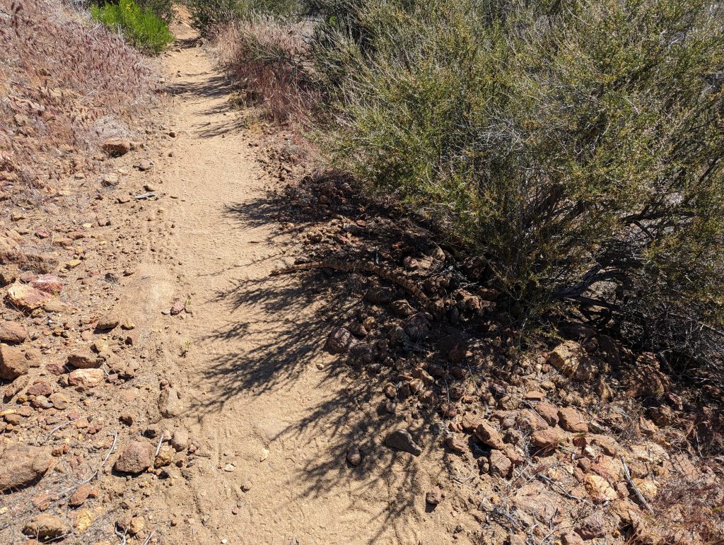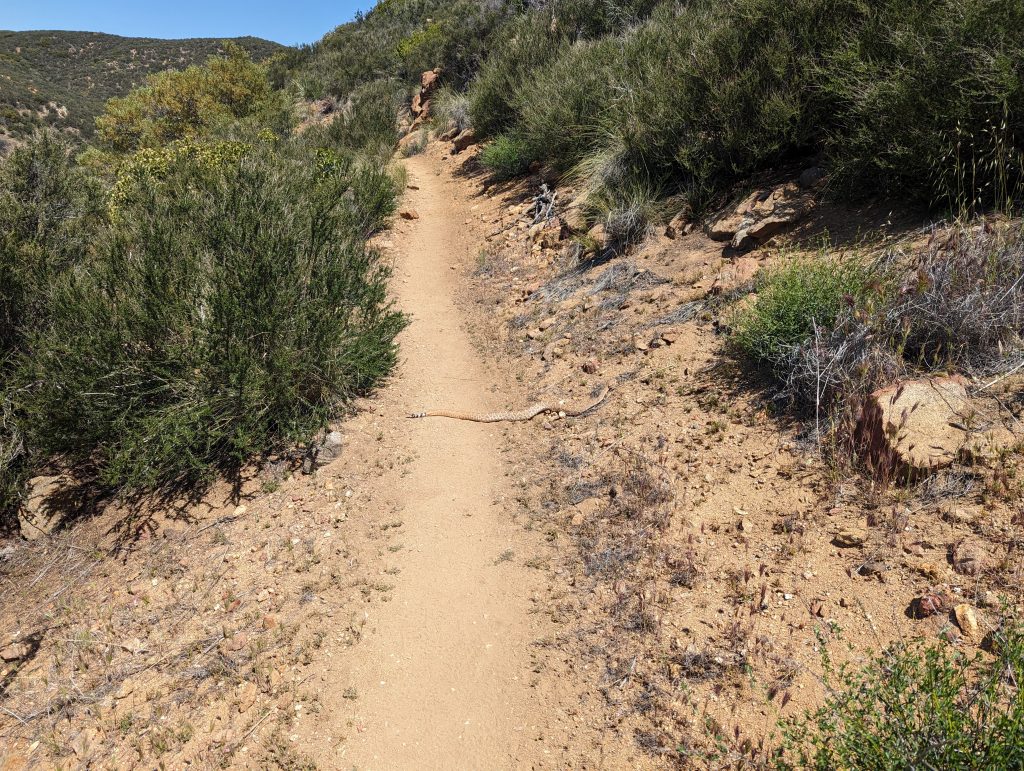 Es geht eine ganze Weile weiter am Hang entlang. Zwischendrin bekomme ich dann wieder eine schöne Klapperschlange zu Gesicht. Obwohl ich dieses Mal rechtzeitig abbremsen und somit einige Meter vor ihr anhalten konnte, fängt sie an zu klappern und zischt mich an. Das klappern ist deutlich lauter als erwartet und ein wirklich gutes Warnsignal für Wanderer wie mich. Schnell trete ich einige Meter zurück und bald darauf macht sich die Schlange wieder auf den Weg ins Gebüsch. Als sie weit genug vom Weg entfernt ist, laufe ich schnell an ihr vorbei.
