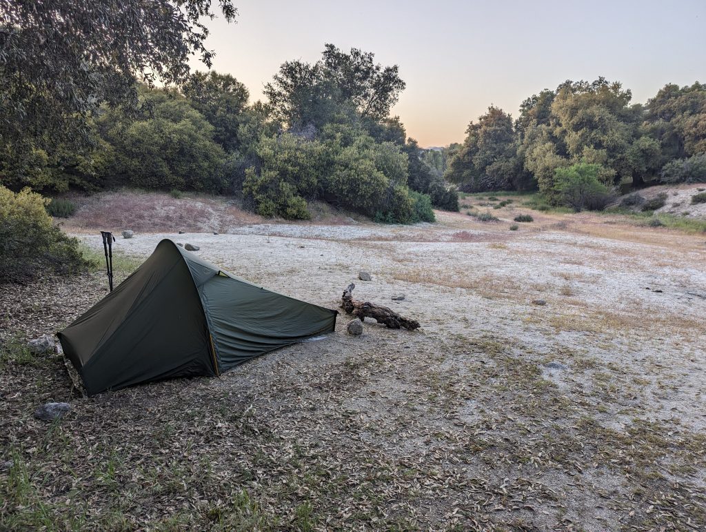 Nach einem letzten kurzen Abschnitt durch den Wald, komme ich am angepeilten Platz an. Anscheinend gehen die meisten Leute weiter bis zum nächsten Camp oder halten wo anders. Denn obwohl es direkt am Weg liegt, ist außer mir niemand da und danach kommt auch niemand mehr vorbei. Eigentlich wollte ich hier heute wieder Cowboy Campen. Da ich während dem Zubereiten des Abendessens aber von Moskitos genervt werde, baue ich doch mein Zelt auf und ziehe mich nach dem Essen dorthin zurück, um auch bald einzuschlafen. Immerhin ist es schon wieder halb 8 und die Sonne bereits untergegangen.