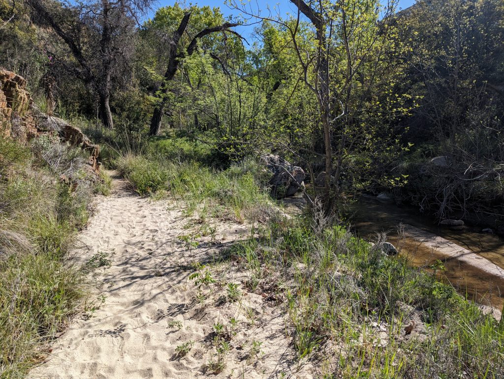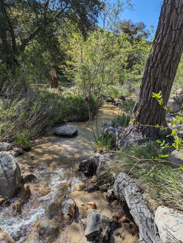Ich laufe einige Zeit mit einer jungen Frau aus Arizona, für die die Gegend hier wie zu Hause aussieht. Nach einiger Zeit geht es dann im Wald am Wasser entlang. Hier überquere ich immer wieder den kleinen Fluss, wo ich öfters mein Wasser auffüllen kann.