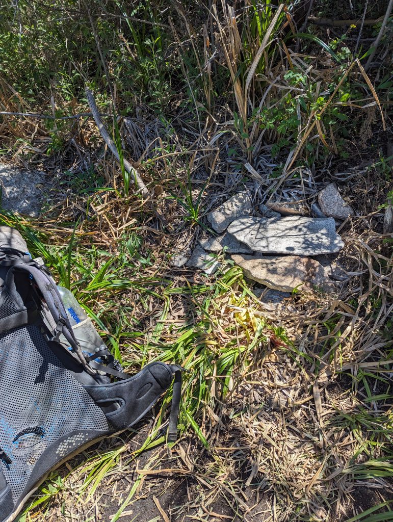 Nach einem längeren Anstieg komme ich um kurz vor zwölf an einem Camp vorbei. Hier finde ich ein schattiges Plätzchen unter einem Strauch, wo ich mich niederlasse. Ich breite meine Isomatte aus und lege mich in den kühlen Schatten. Kurze Zeit später kommt ein Kanadier vorbei. Er möchte an einer etwas entfernten Wasserstellen seine Reserven für die weitere Strecke auffüllen. Da ich gelesen habe, dass es eher ein stinkender Tümpel sein soll, verzichte ich darauf und mache lieber einen kurzen Mittagsschlaf. Als er zurückkehrt, meint er nur, dass es wirklich nicht das beste Wasser sei, aber man es nach dem filtern gut trinken können. Wir unterhalten uns noch etwa eine halbe Stunde, bevor ich mich dann wieder auf den Weg mache. Ich habe zwar nur noch einen halben Liter Wasser für 12 km, aber ich hoffe zwischendrin eine Stelle zum Auffüllen zu finden und ansonsten werde ich es auch mit dem halben Liter schaffen.