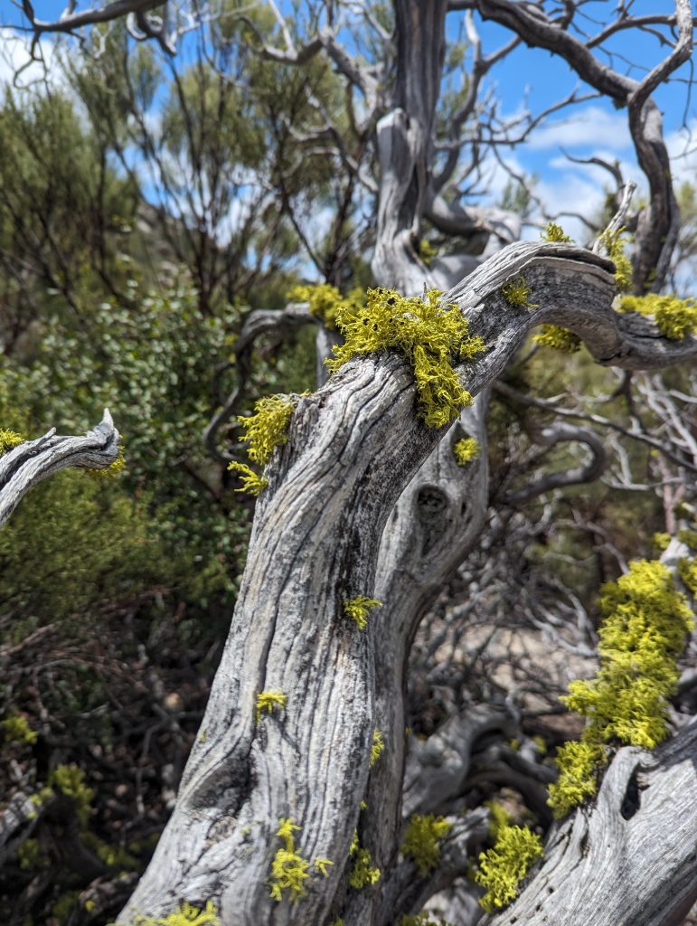 Lange Zeit geht es an den Bergwand entlang auf und ab. Immer wieder komme ich an toten Bäumen vorbei und teilweiße fliegt Eis, welches sich wahrscheinlich gestern im Sturm an den Bäumen angesammelt hat, auf mich herab.