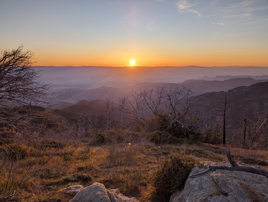 Während rechts langsam die Sonne aufgeht, kann ich links noch Wolken sehen, die in den Bergen hängen.