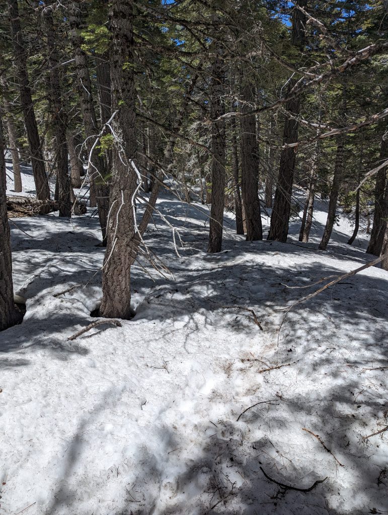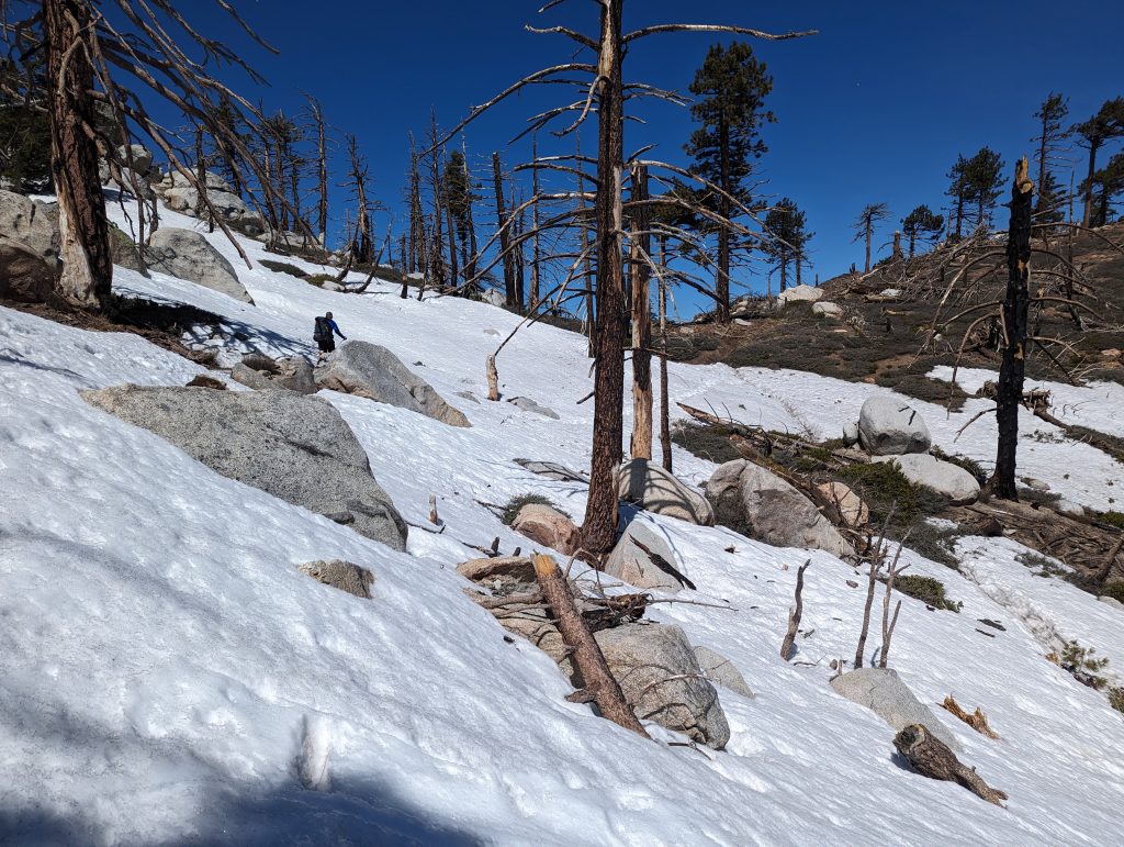 Danach geht es noch weiter hinauf und bald erreiche ich den ersten Pass, den es zu überwinden gibt. Hier liegt doch deutlich mehr Schnee als erwartet, aber insgesamt komme ich auch ohne Microspikes gut zurecht. Auf dem teilweise angefrorenen Schnee kann man gut laufen, aber trotzdem komme ich deutlich langsamer voran als erhofft.