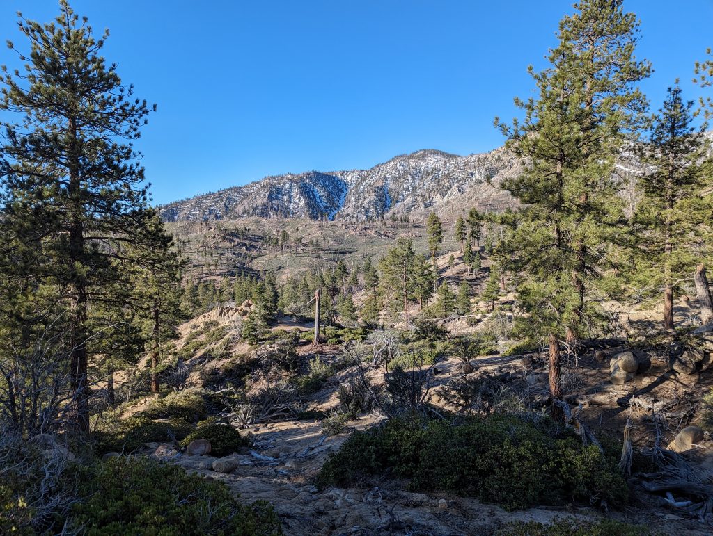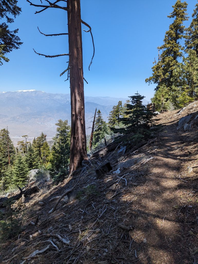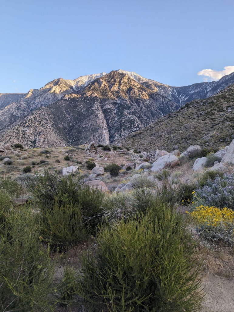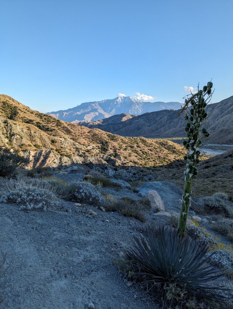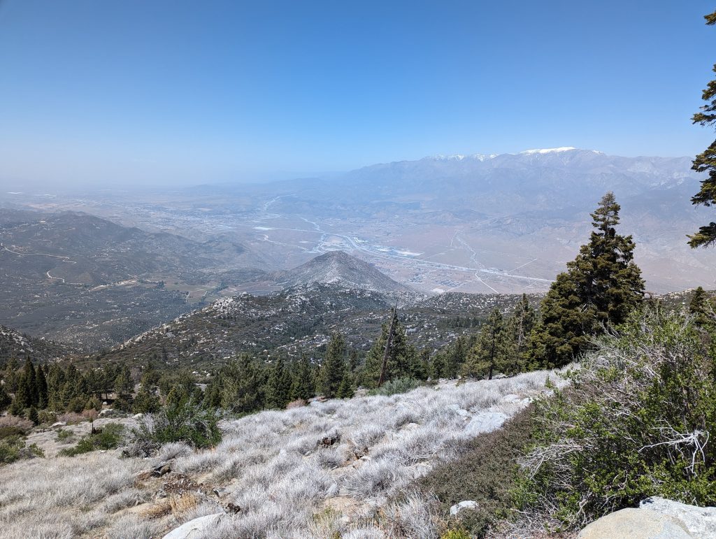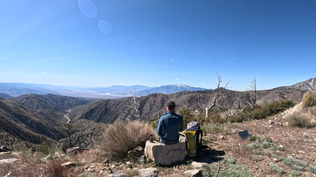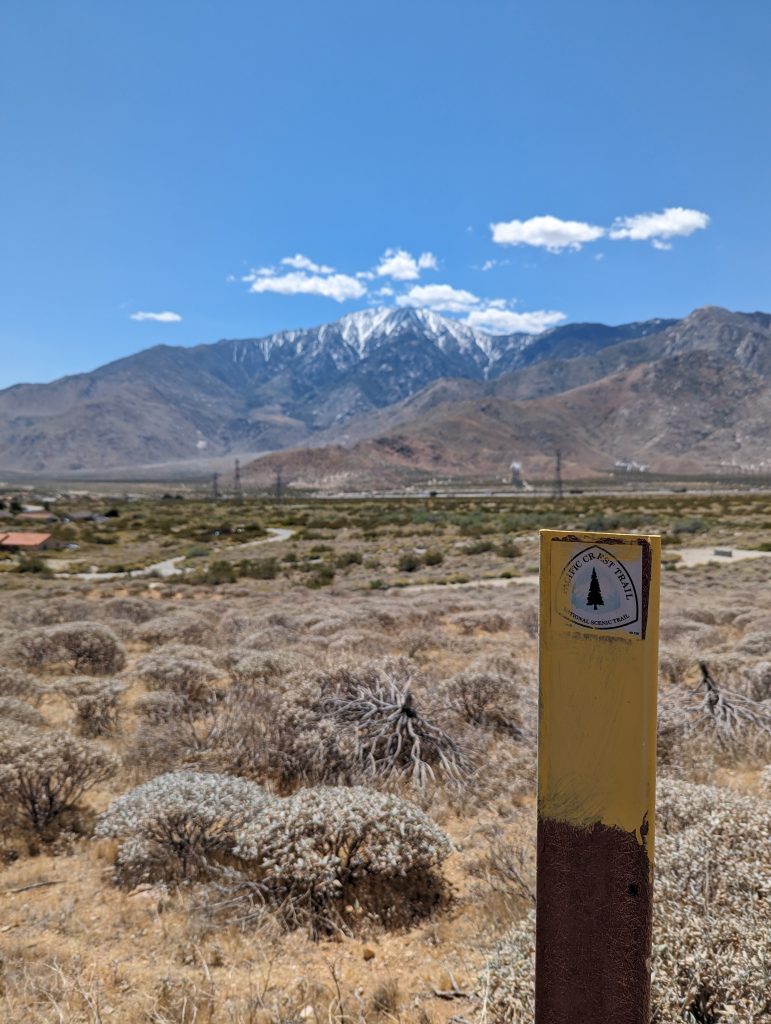 Neben den vielen tollen Bäumen, kann ich auch die schneebedeckten Berge in der Umgebung bestaunen. An einem Platz mit schöner Aussicht, setzte ich mich in die wohltuende Sonne und mache Kaffeepause. Dabei kann ich den Weg der letzten Tage betrachten. Der weiße Gipfel rechts ist der Mount San Jacinto, auf dem ich vor ein paar Tagen übernachtet habe und das Flussbett links im Bild, war der anstrengende Tag gestern. So ist es immer wieder interessanten zu sehen, welche Strecke man bereits zurückgelegt hat.