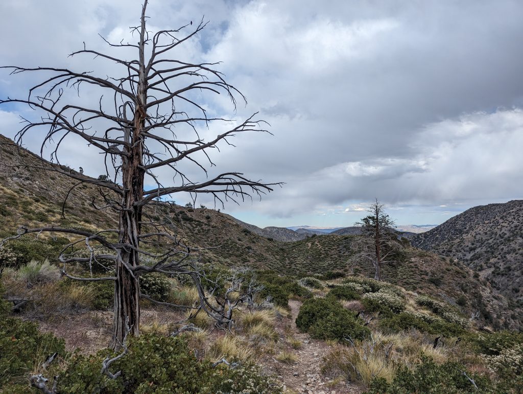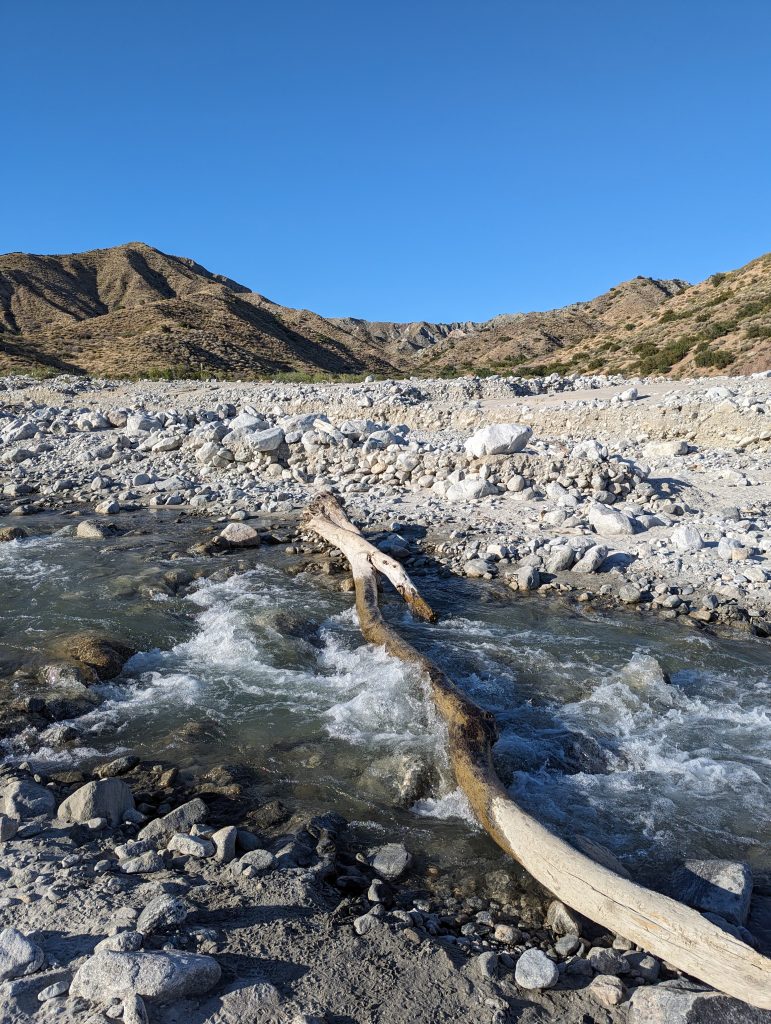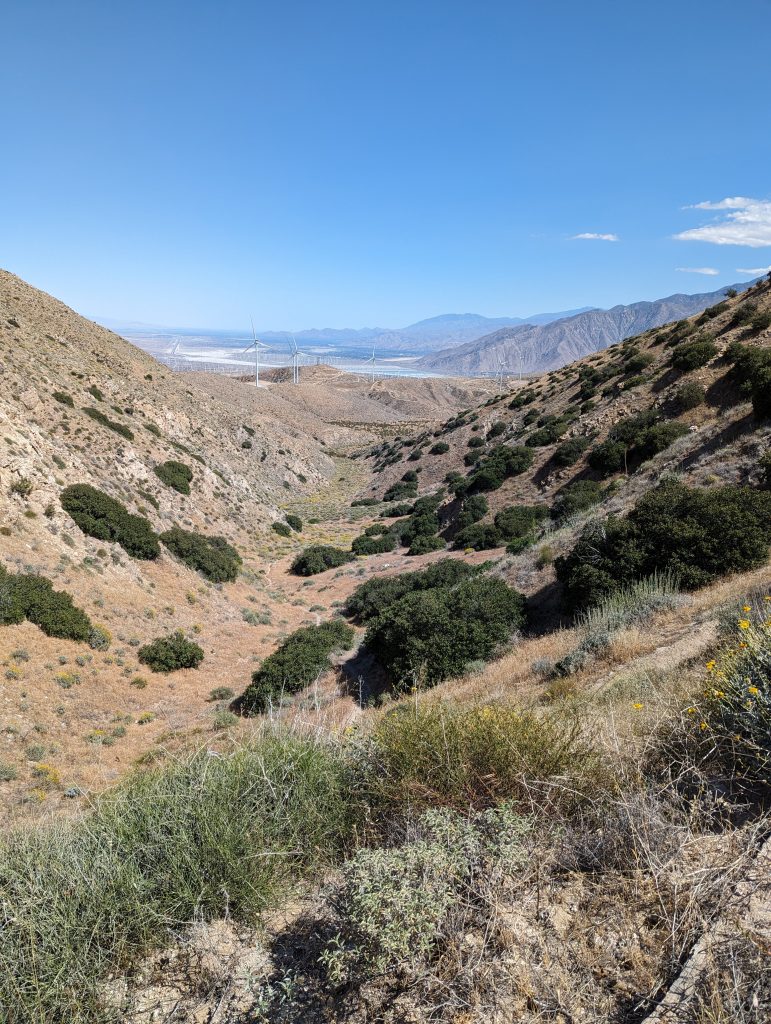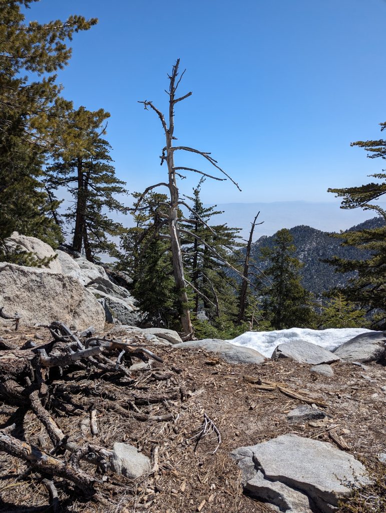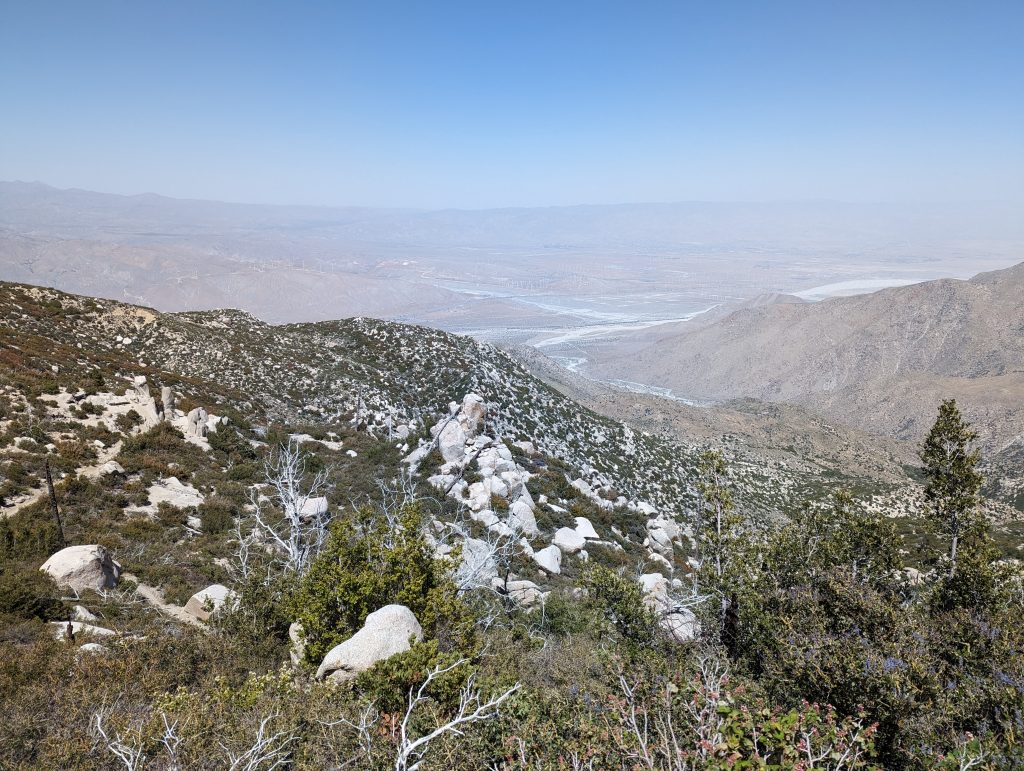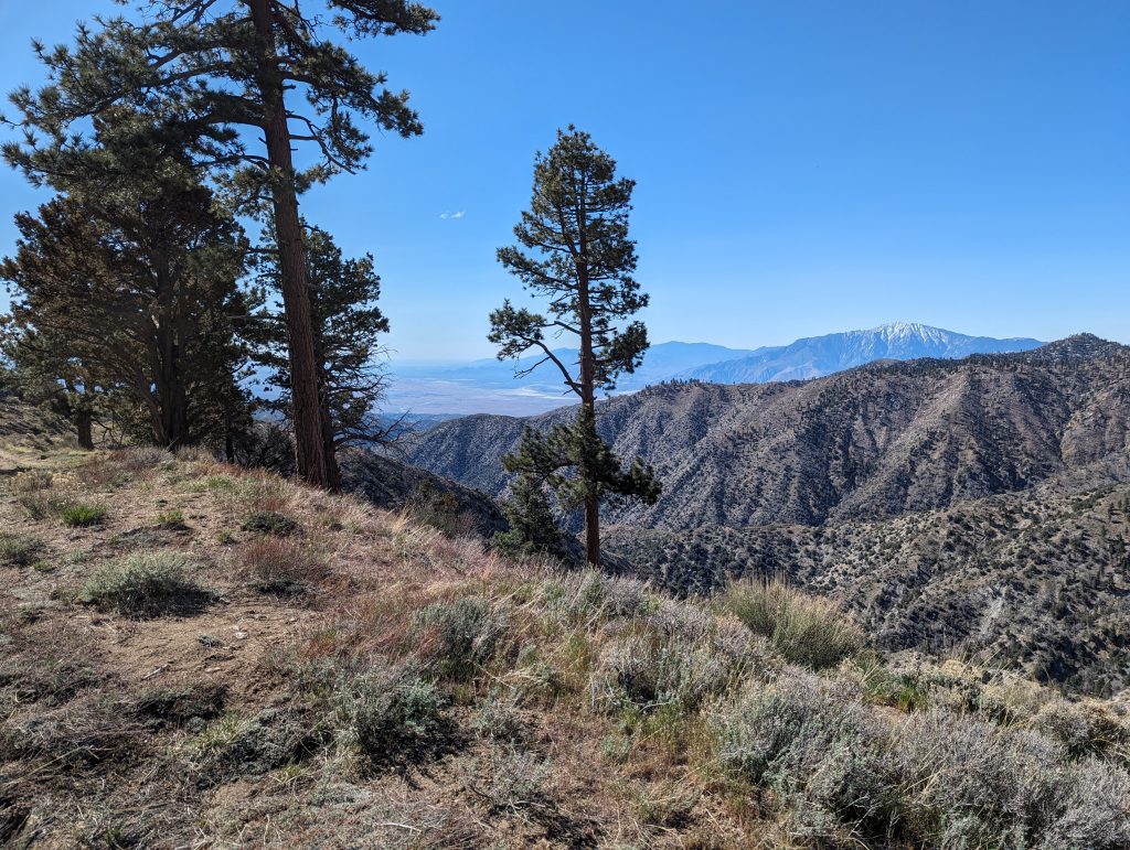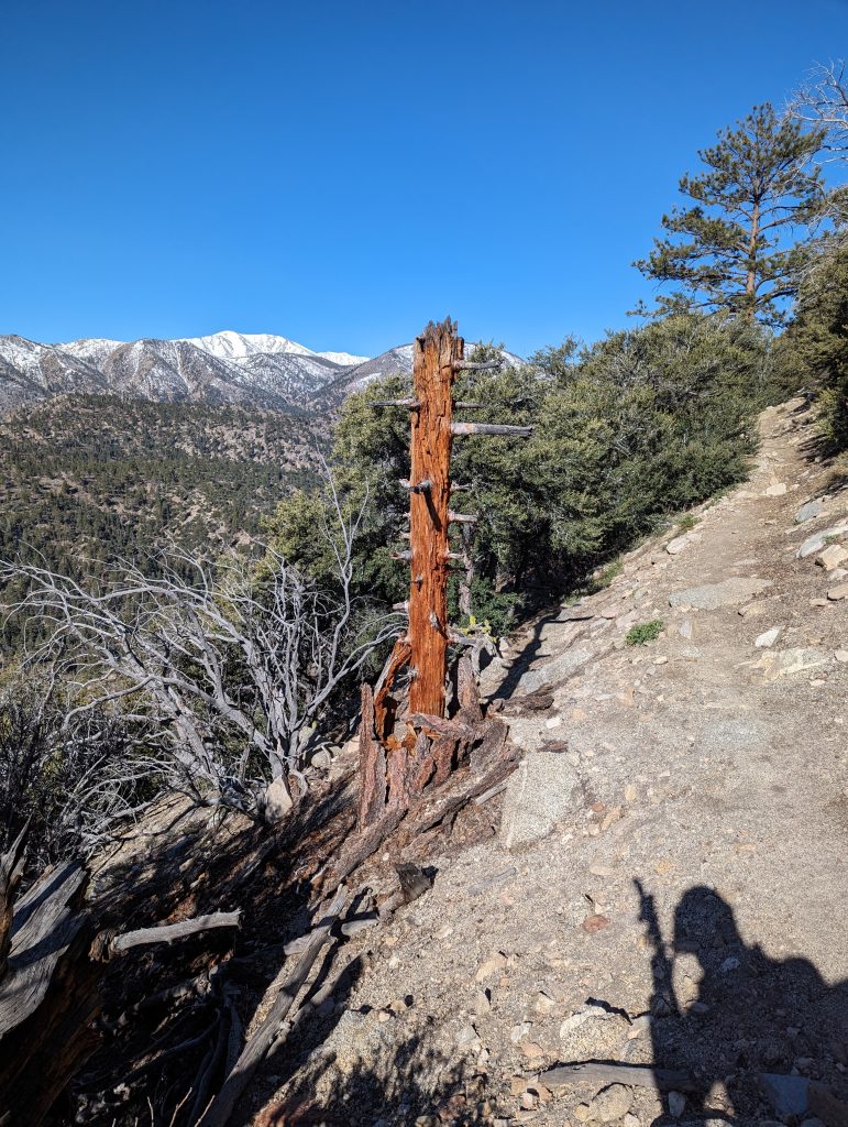 Neben den vielen tollen Bäumen, kann ich auch die schneebedeckten Berge in der Umgebung bestaunen. An einem Platz mit schöner Aussicht, setzte ich mich in die wohltuende Sonne und mache Kaffeepause. Dabei kann ich den Weg der letzten Tage betrachten. Der weiße Gipfel rechts ist der Mount San Jacinto, auf dem ich vor ein paar Tagen übernachtet habe und das Flussbett links im Bild, war der anstrengende Tag gestern. So ist es immer wieder interessanten zu sehen, welche Strecke man bereits zurückgelegt hat.