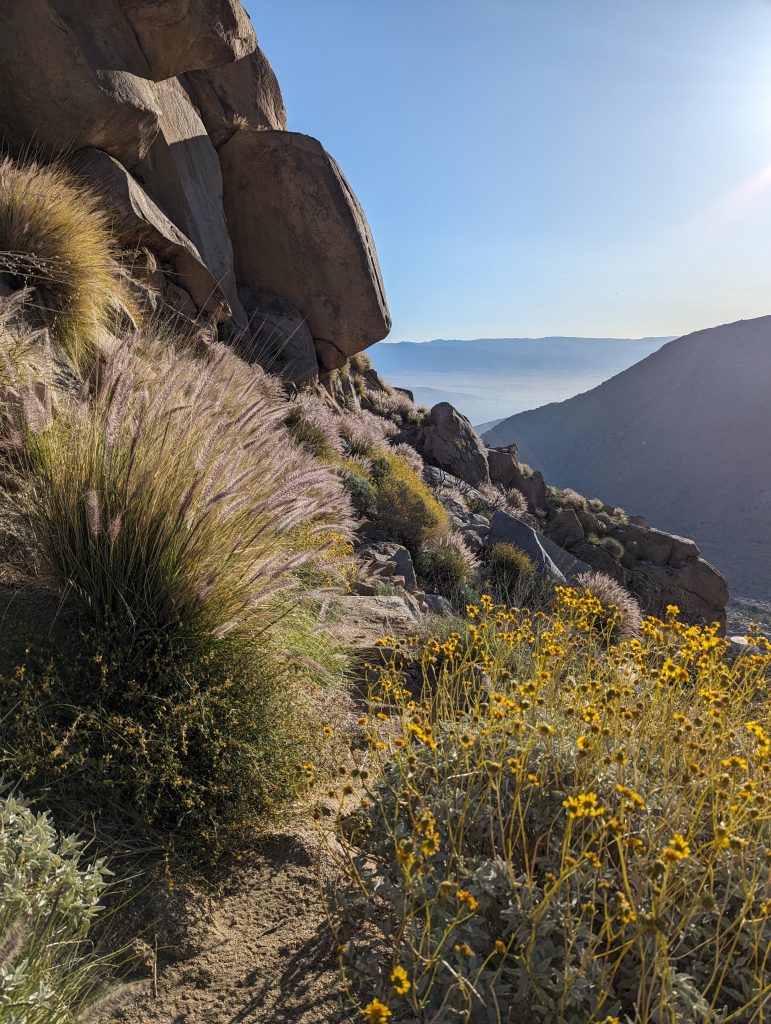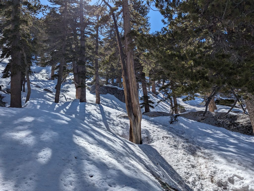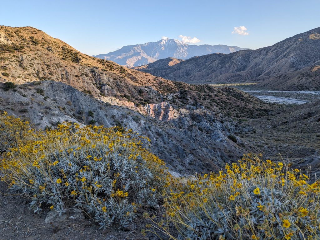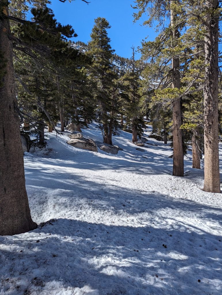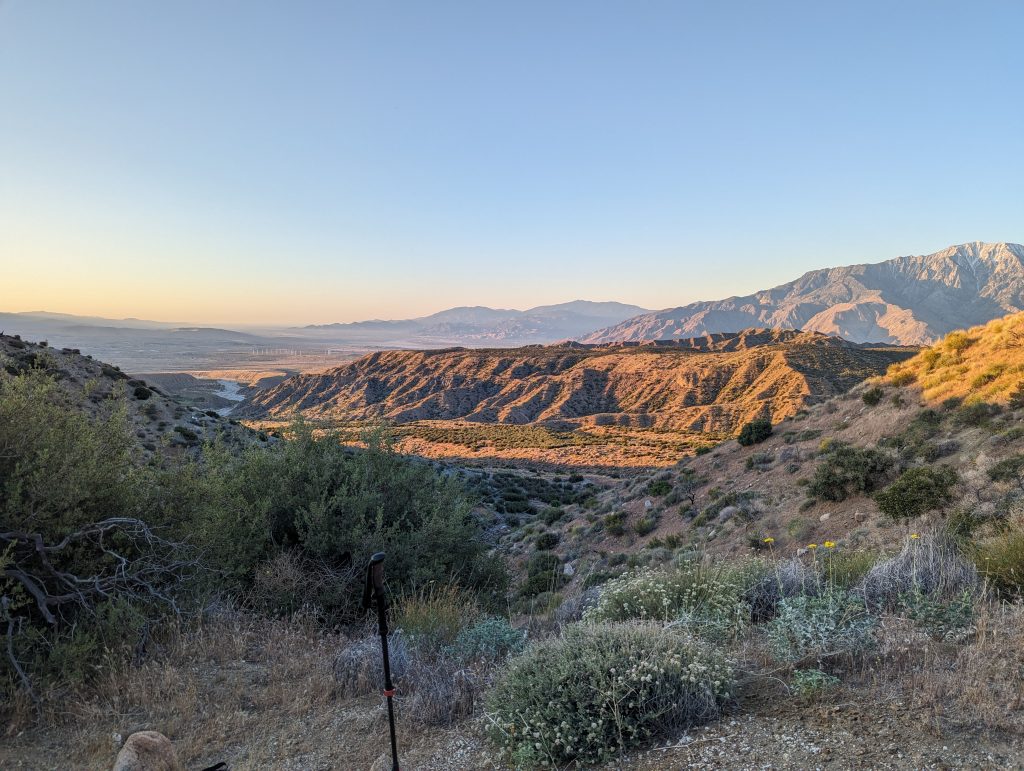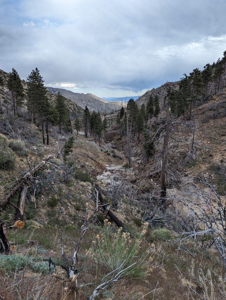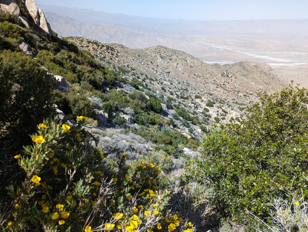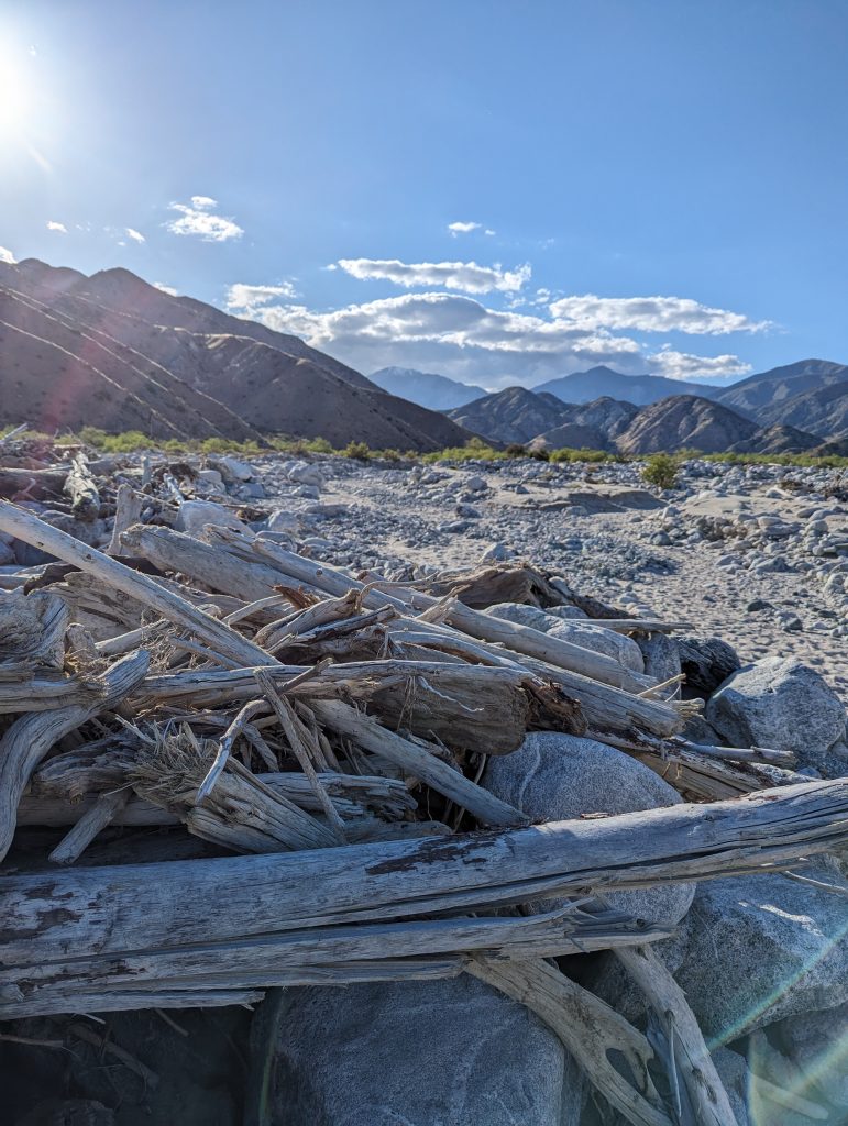 Neben den vielen tollen Bäumen, kann ich auch die schneebedeckten Berge in der Umgebung bestaunen. An einem Platz mit schöner Aussicht, setzte ich mich in die wohltuende Sonne und mache Kaffeepause. Dabei kann ich den Weg der letzten Tage betrachten. Der weiße Gipfel rechts ist der Mount San Jacinto, auf dem ich vor ein paar Tagen übernachtet habe und das Flussbett links im Bild, war der anstrengende Tag gestern. So ist es immer wieder interessanten zu sehen, welche Strecke man bereits zurückgelegt hat.