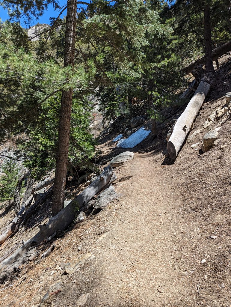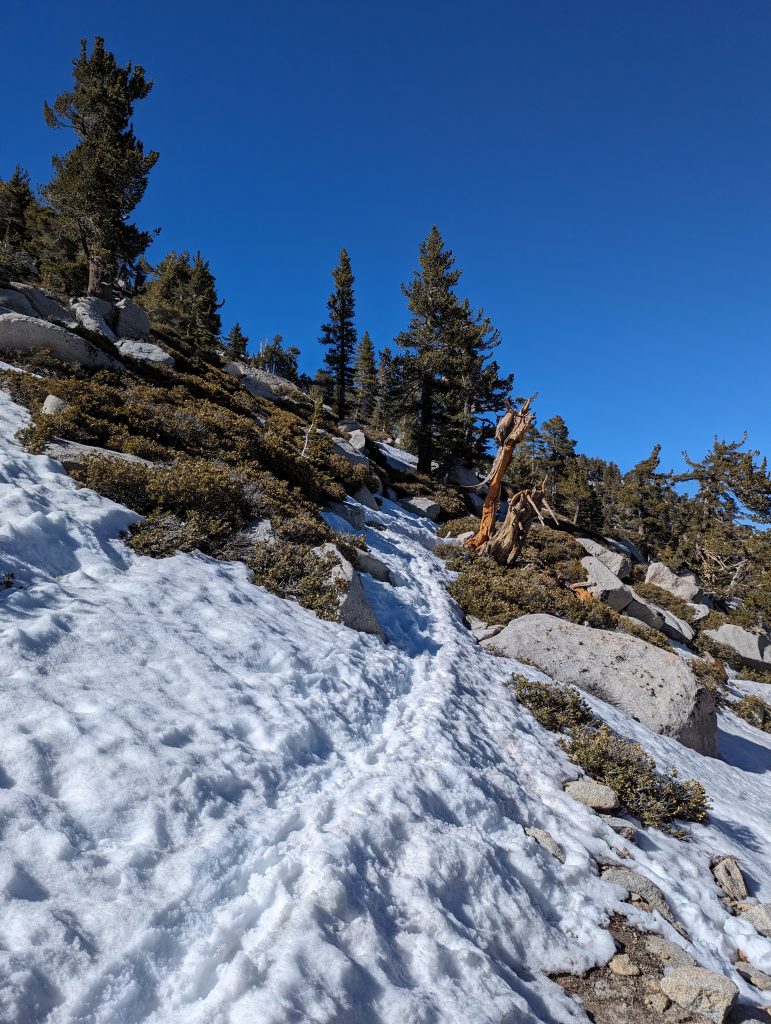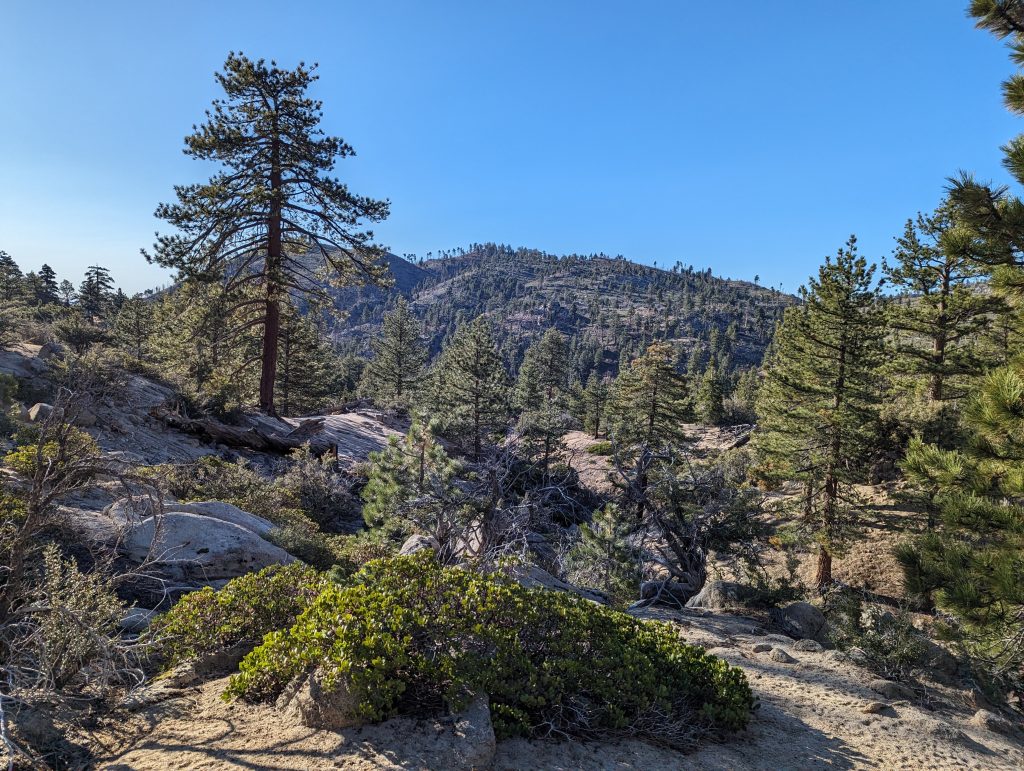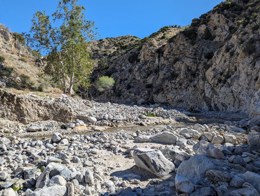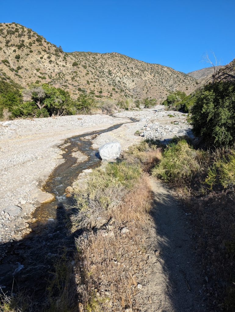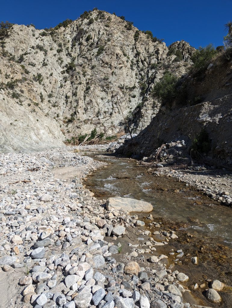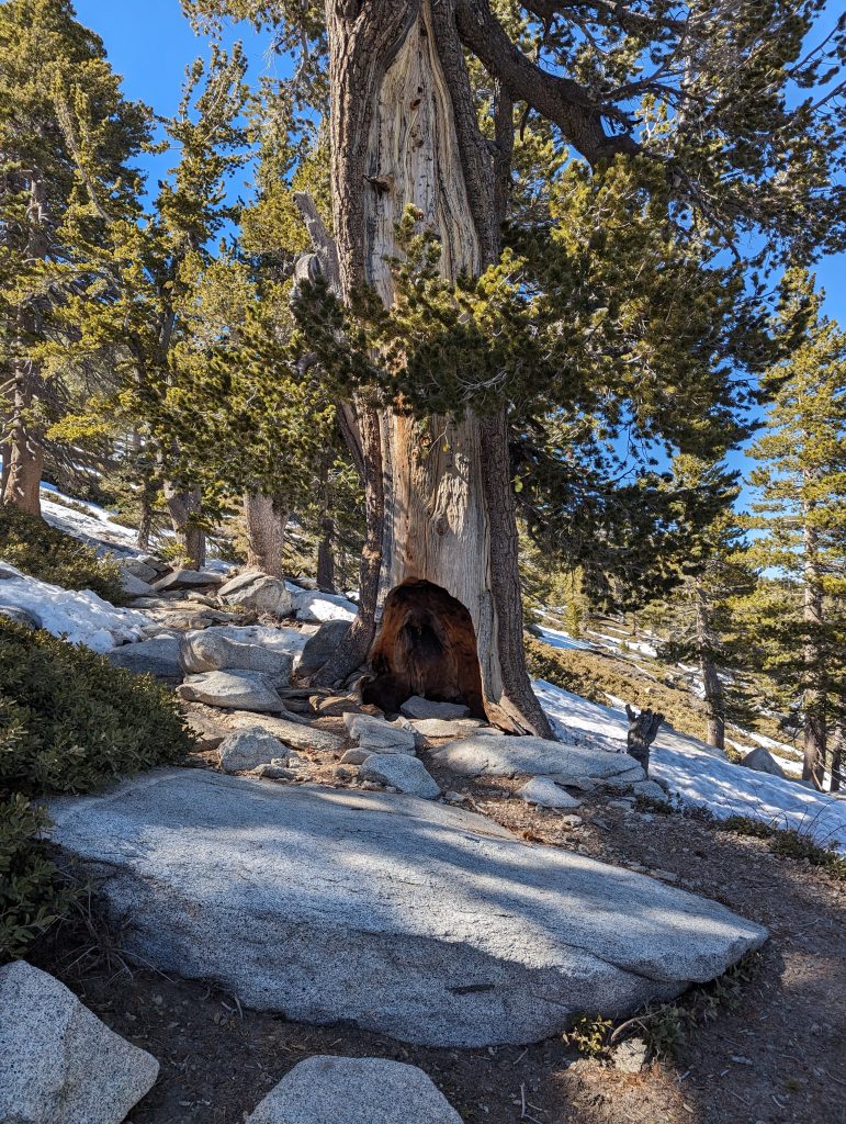 Neben den vielen tollen Bäumen, kann ich auch die schneebedeckten Berge in der Umgebung bestaunen. An einem Platz mit schöner Aussicht, setzte ich mich in die wohltuende Sonne und mache Kaffeepause. Dabei kann ich den Weg der letzten Tage betrachten. Der weiße Gipfel rechts ist der Mount San Jacinto, auf dem ich vor ein paar Tagen übernachtet habe und das Flussbett links im Bild, war der anstrengende Tag gestern. So ist es immer wieder interessanten zu sehen, welche Strecke man bereits zurückgelegt hat.