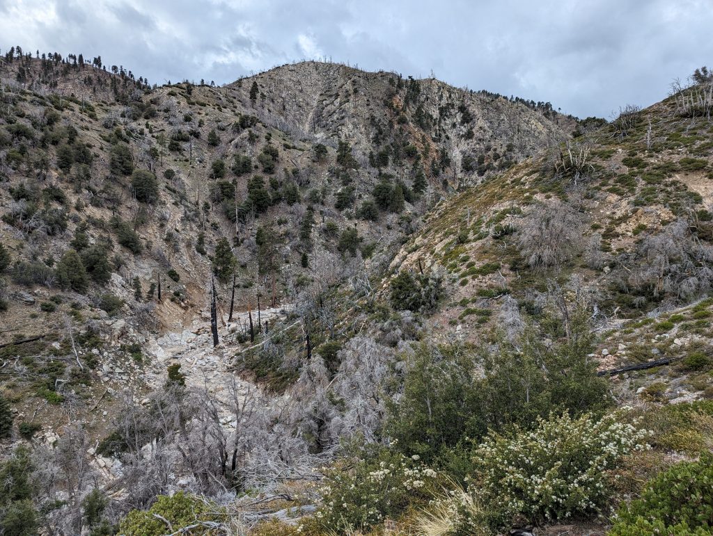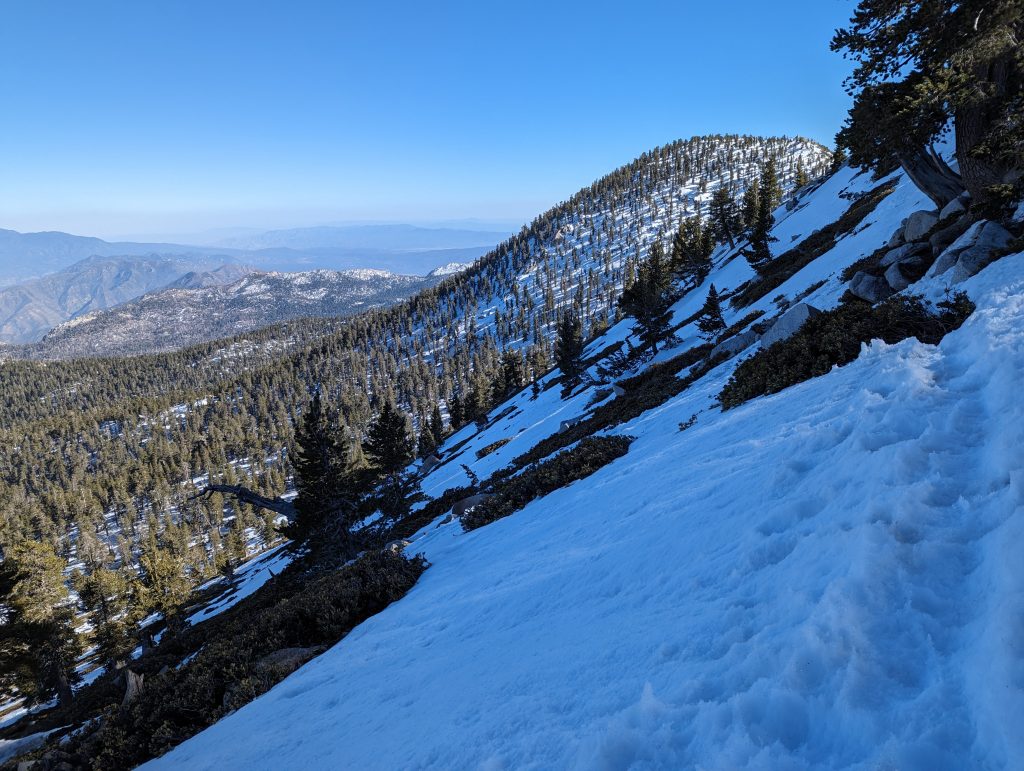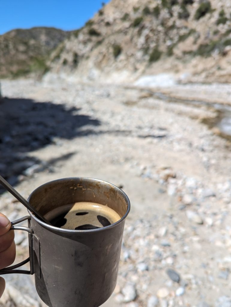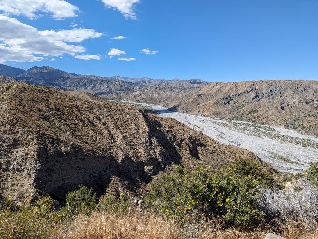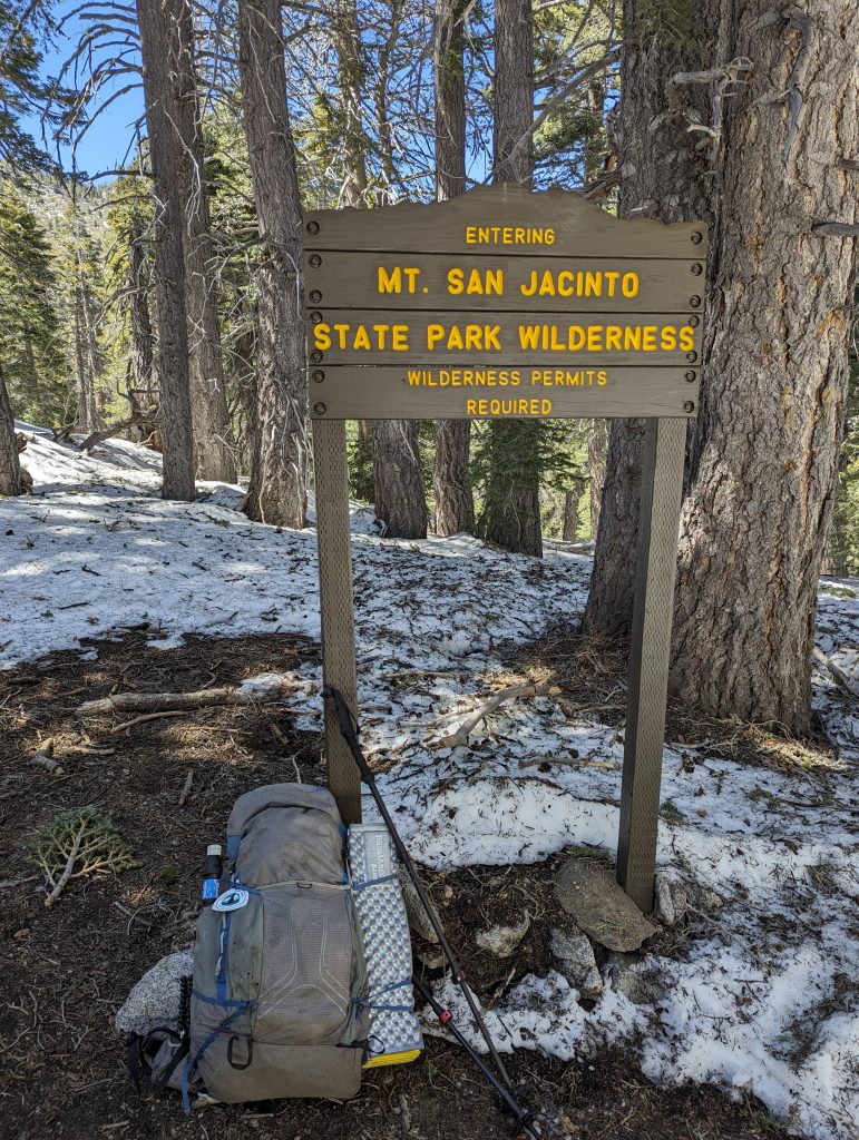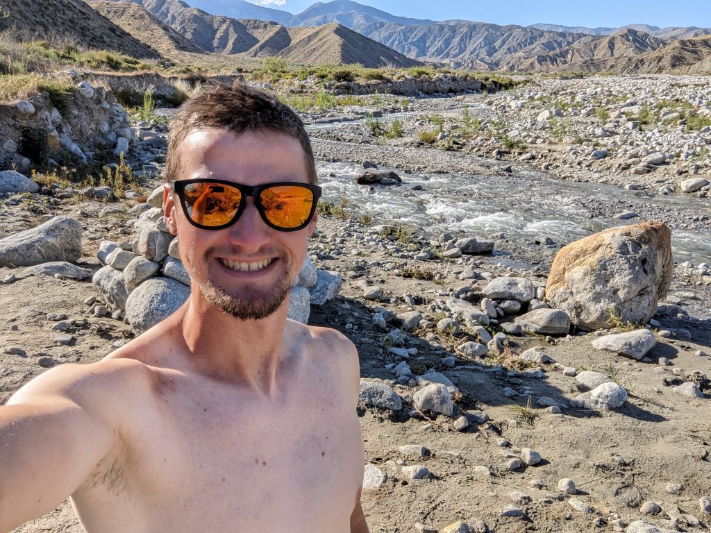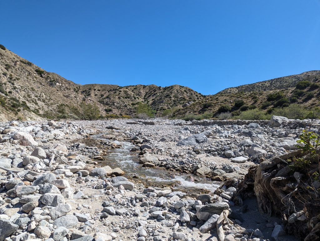 Neben den vielen tollen Bäumen, kann ich auch die schneebedeckten Berge in der Umgebung bestaunen. An einem Platz mit schöner Aussicht, setzte ich mich in die wohltuende Sonne und mache Kaffeepause. Dabei kann ich den Weg der letzten Tage betrachten. Der weiße Gipfel rechts ist der Mount San Jacinto, auf dem ich vor ein paar Tagen übernachtet habe und das Flussbett links im Bild, war der anstrengende Tag gestern. So ist es immer wieder interessanten zu sehen, welche Strecke man bereits zurückgelegt hat.