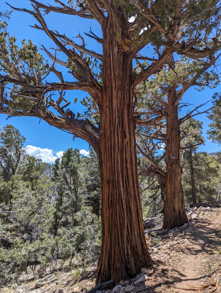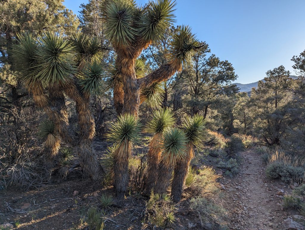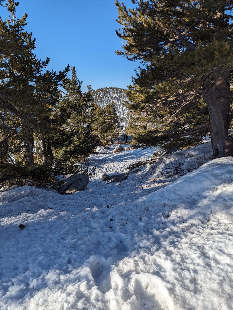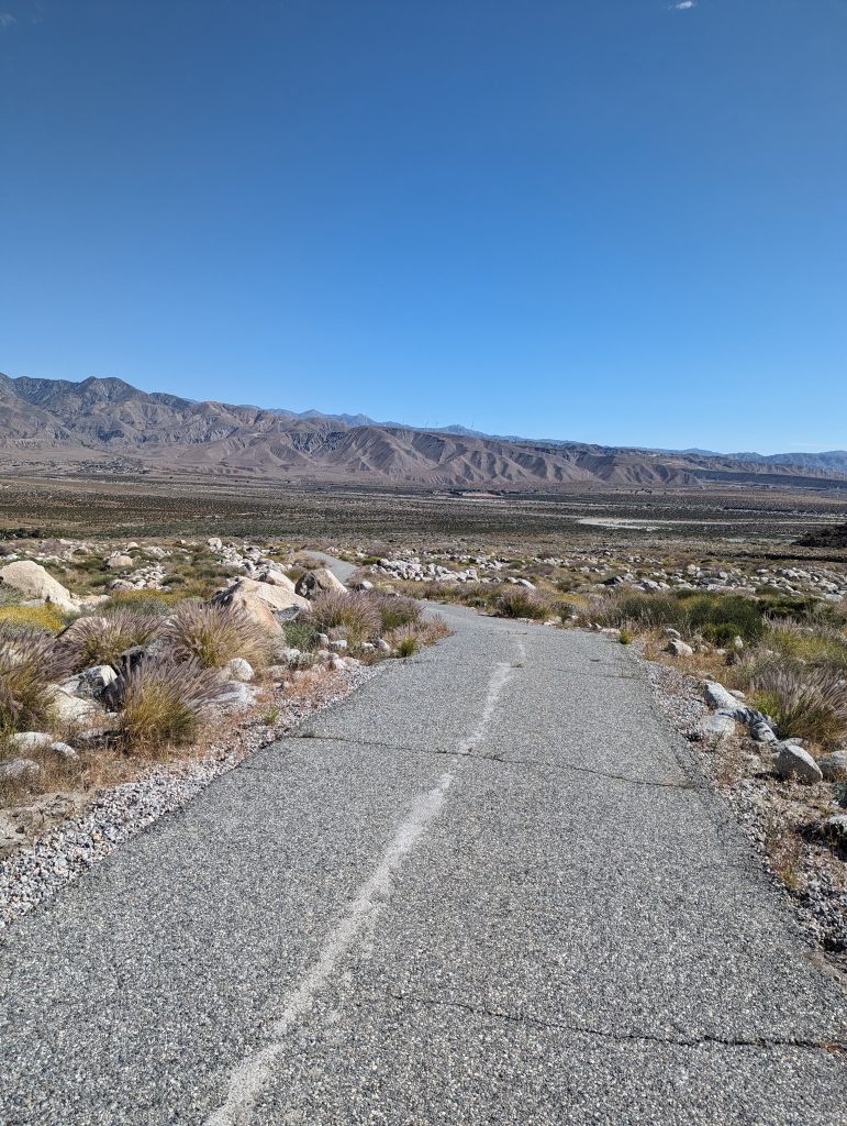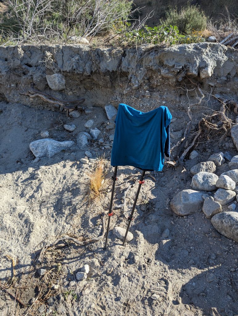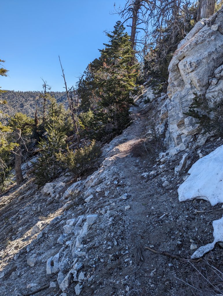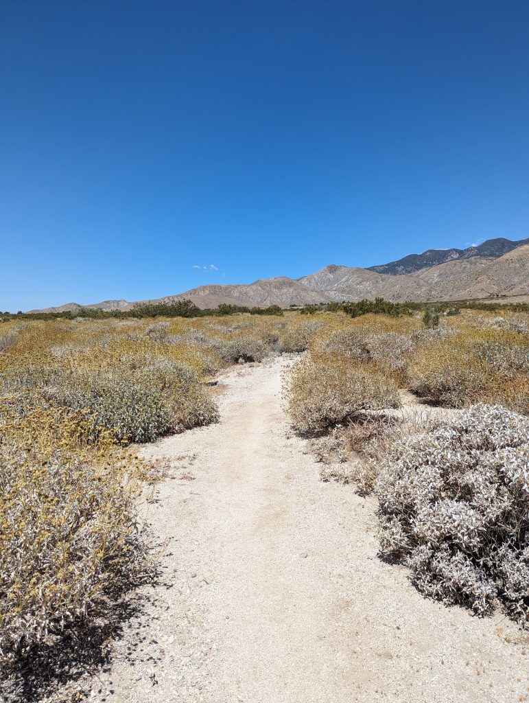 Neben den vielen tollen Bäumen, kann ich auch die schneebedeckten Berge in der Umgebung bestaunen. An einem Platz mit schöner Aussicht, setzte ich mich in die wohltuende Sonne und mache Kaffeepause. Dabei kann ich den Weg der letzten Tage betrachten. Der weiße Gipfel rechts ist der Mount San Jacinto, auf dem ich vor ein paar Tagen übernachtet habe und das Flussbett links im Bild, war der anstrengende Tag gestern. So ist es immer wieder interessanten zu sehen, welche Strecke man bereits zurückgelegt hat.