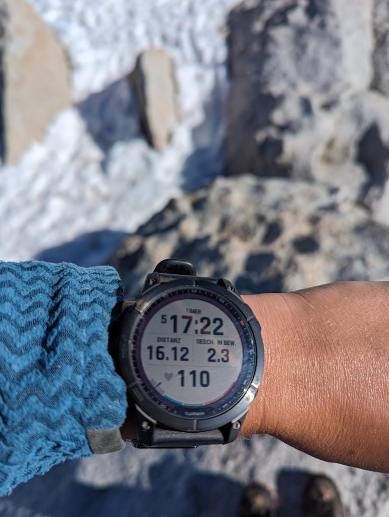 Direkt an der Kreuzung treffe ich auf andere Hiker. Ich unterhalte mich mit ihnen über eine alternative Route, die über den höchsten Gipfel der Gegend führen würde. Einige meinen, dass es ohne Spikes und Pickel nicht möglich sei und schon garnicht Mittags. Andere meinen, dass es mit ein bisschen Erfahrung in Schnee und Eis sicher auch so möglich sei. Da aber keiner von ihnen oben war, sind es auch nur Spekulationen, wie es wirklich aussieht.