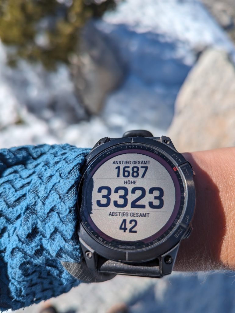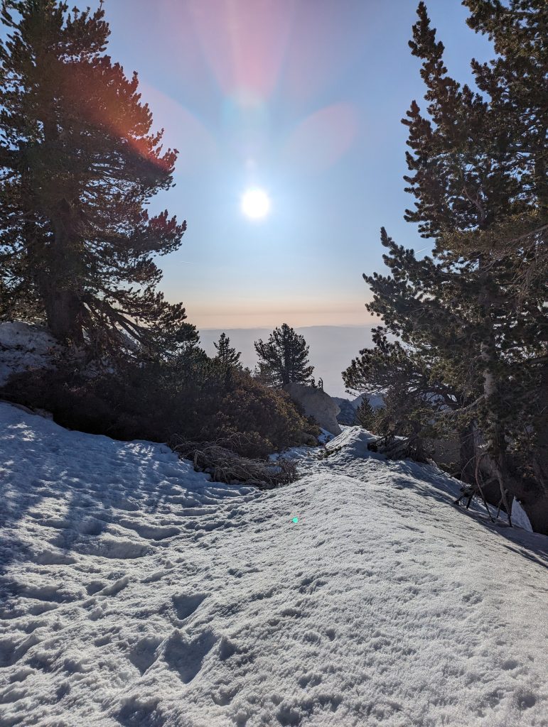 Immer wieder kommen mir Leute von oben entgegen, aber ich sehe niemanden auf dem Weg in Richtung Gipfel. Mit der Zeit wird der Weg steiler und auch etwas gefährlicher. Weiter oben gibt es dann doch die ein oder andere Stelle, an der eine Eisaxt eventuell sinnvoll wäre. Zumindest geht es links ziemlich steil bergab und wenn ich hier ins Rutschen komme, kann es böse enden. Umso vorsichtiger Laufe ich an diesen Stellen weiter nach oben und schlage mir mit den Schuhen kleine Stufen in den Schnee, um einen sicheren Halt zu haben.