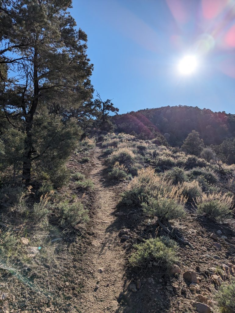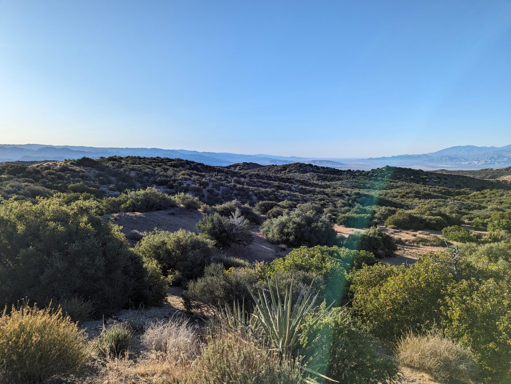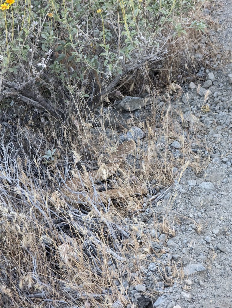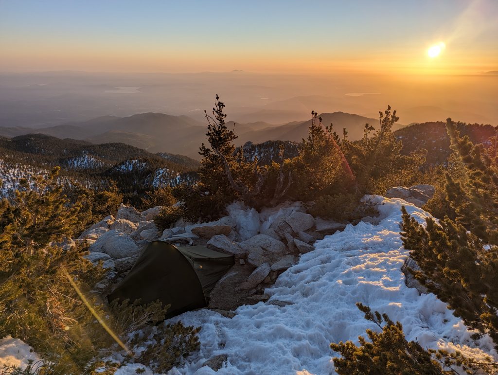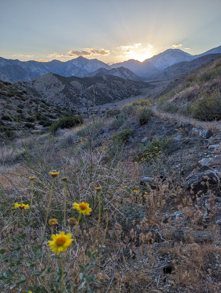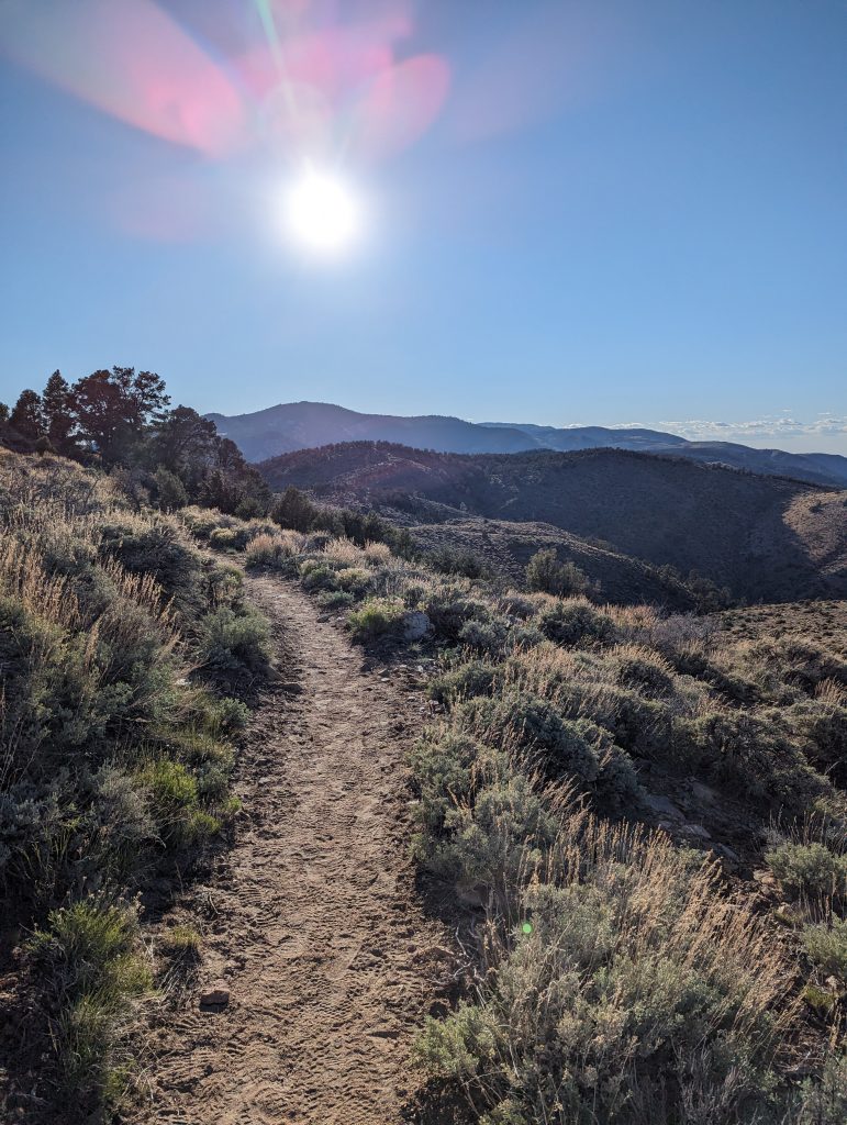 Trotzdem laufe ich in der Abendsonne weiter nach oben, da ich mir einen guten Schlafplatz auf dem Kamm des Berges erhoffe. Während hinter mir bereits die Sonne untergeht, was die Landschaft wieder traumhaft schön wirken lässt, laufe ich immer weiter hinauf. Unterwegs treffe ich dann wieder auf eine Klapperschlange und bin nun schon bei 5 angelangt.