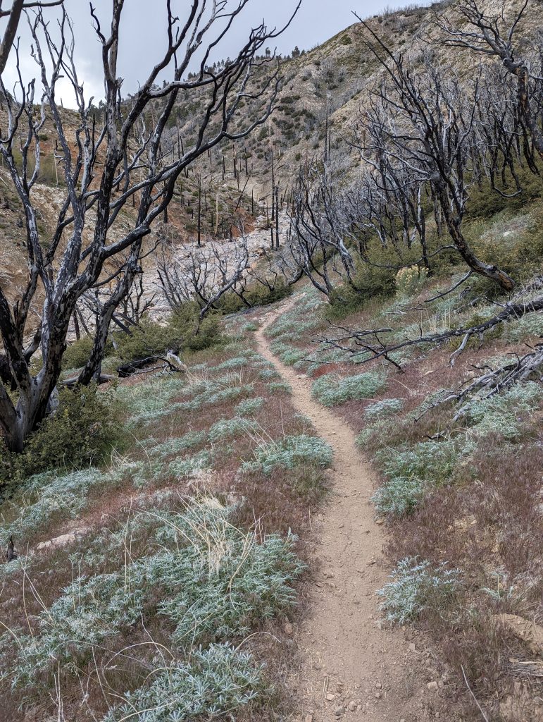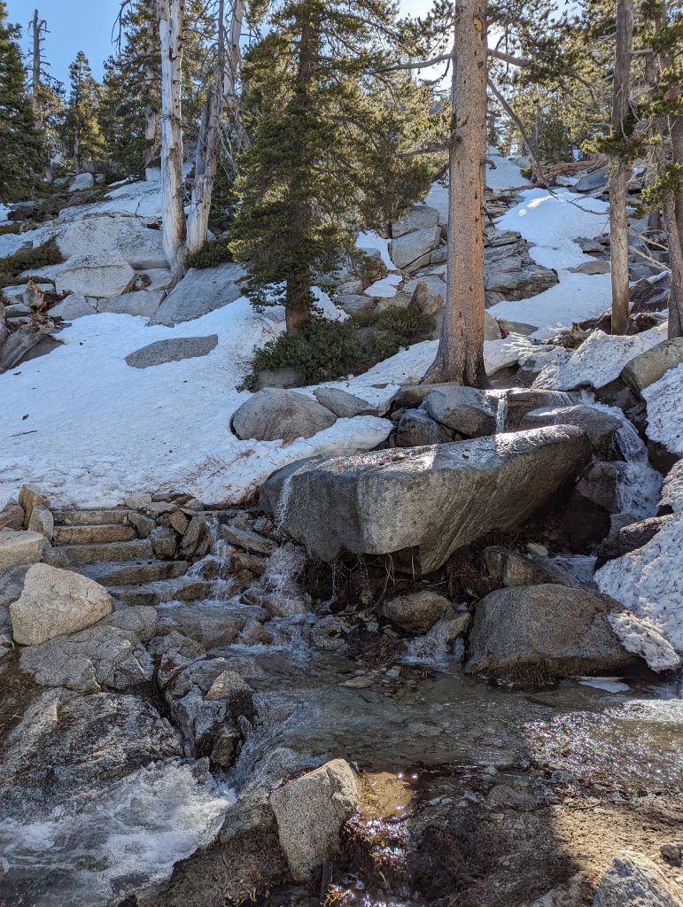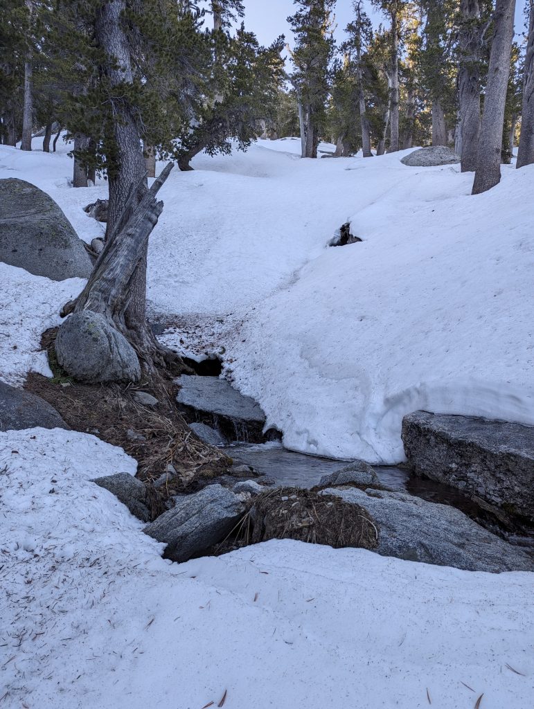 Nach einem längeren Abstieg, komme ich endlich wieder auf die eigentlich PCT-Route. Aber auch hier bin ich weiterhin im Schnee unterwegs und zwischendrin geht es durchs Gebüsch. Der Weg ist nicht immer ganz klar, da der Schnee darüber liegt und anscheinend jeder versucht, seinen eigenen Weg zu finden. Manchmal endet eine Spur einfach irgendwo im nirgendwo und ich muss umkehren. Irgendwo in diesem Wirrwarr verliere ich dann meine Wasserflasche mit meinem Wasserfilter. Als ich es aber bemerke, ist es schon zu spät, da sie überall sein könnte. Ich laufe einfach weiter durch den Schnee.