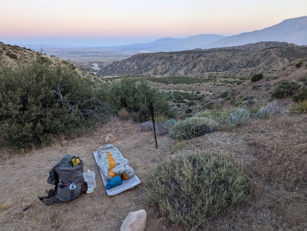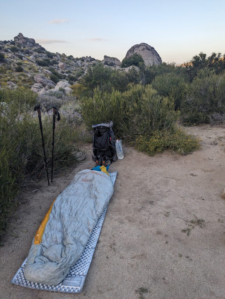 Die ersten guten Campspots sind bereits belegt, aber weiter hinten finde ich einen guten Platz, der zwar nicht besonders groß, aber zum Cowboy Campen ausreichen sollte. Ich steige vom Weg dorthin hinab, breite meine Sachen aus und esse schnell zu Abend.