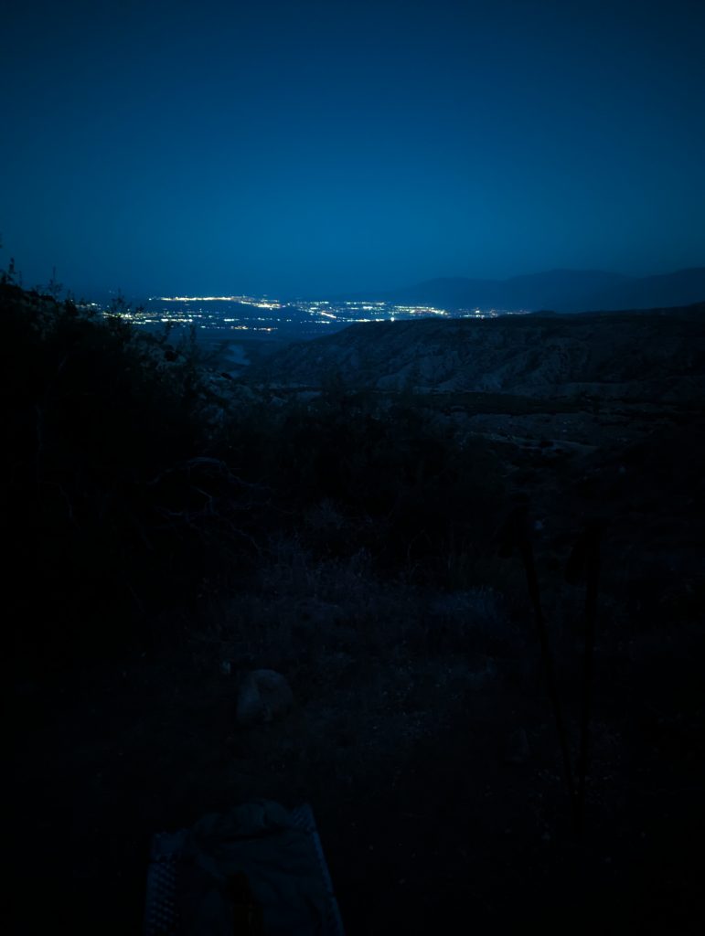 Dann ist es auch schon dunkel und ich mache mich bettfertig. Von meinem Schlafsack aus, kann ich vor mir in die Landschaft schauen und sehe, wie in einer der Städte die Lichter angehen. Später werden dann wieder die Sterne über mir sichtbar und ich schlafe erschöpft, aber entspannt ein.
