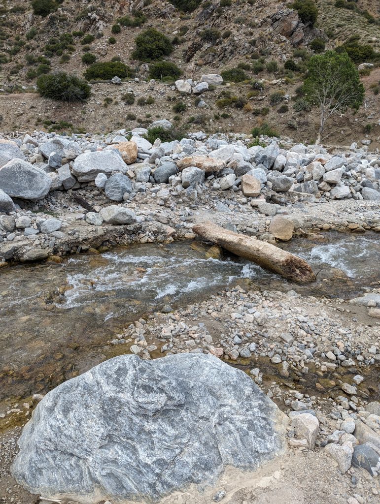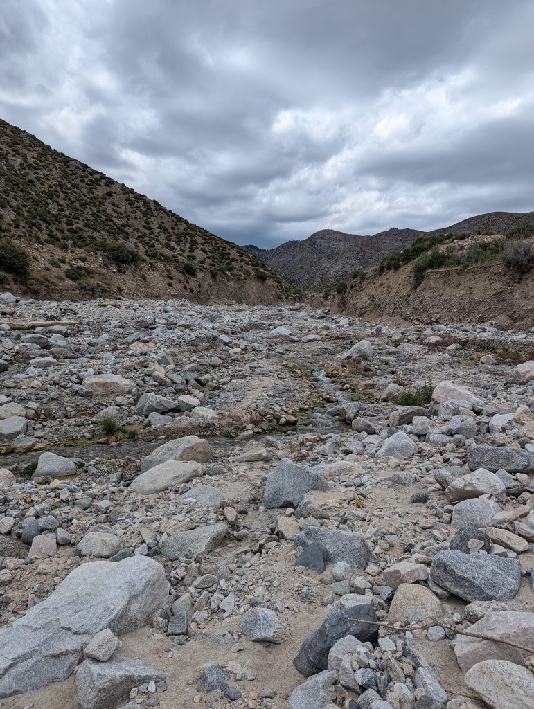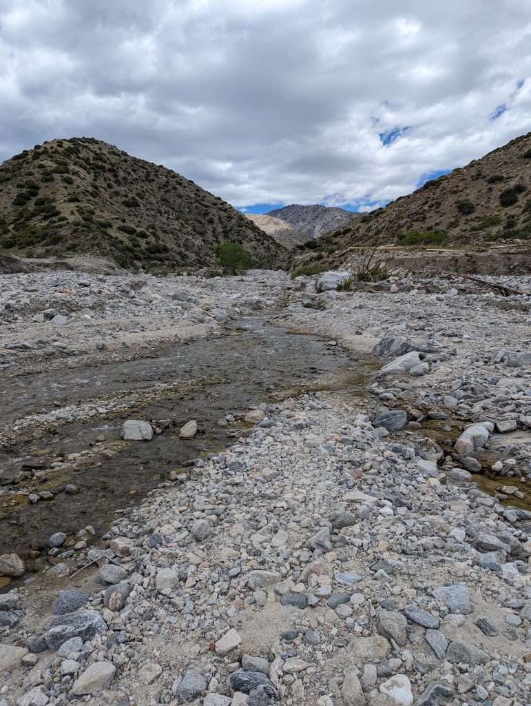 Da das Laufen auf dem unebenen Untergrund, der aus Sand und runden Steinen besteht, sehr anstrengenden ist, mache ich bereits um 9 Uhr eine erste Pause. Wirklich viel Strecke habe ich bis dahin noch nicht zurückgelegt. Leider ist auch keine Besserung in Sicht, denn ich muss weitere 7 Meilen dem Fluss aufwärts folgen. Der eigentliche Weg, wurde von den Wassermassen weggeschwemmt und ist somit nicht mehr vorhanden. Es bleibt mir also nichts anderes übrig, als weiter durch das Flussbett zu wandern.