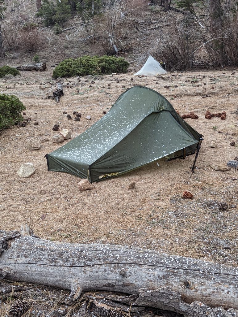Nach einem letzten Abschnitt, auf dem wir über zahlreiche Baumstämme klettern müssen, erreichen wir gegen 18 Uhr endlich das Camp, worüber ich mich nach den anstrengenden 26 km sehr freue. Gerade als ich mein Zelt aufgebaut habe, fängt es dann auch noch an zu schneien.