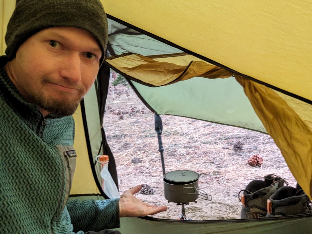 Somit koche ich mein Abendessen heute unter dem Schutz des Zeltes und verspeise es in meiner kleinen Unterkunft.