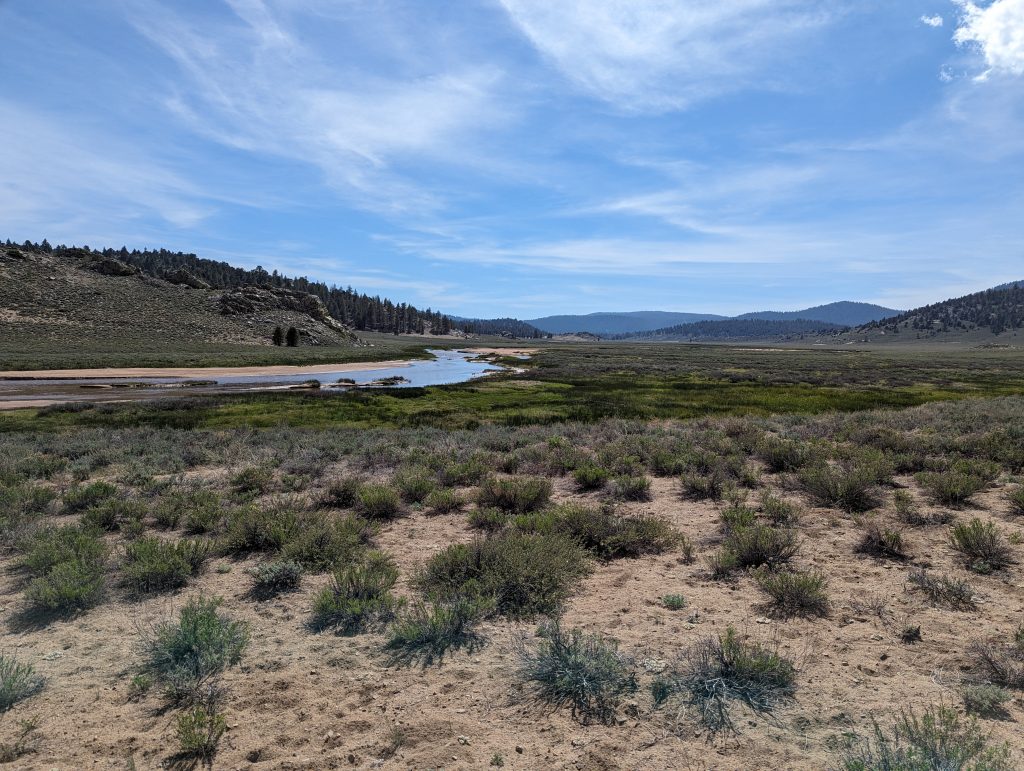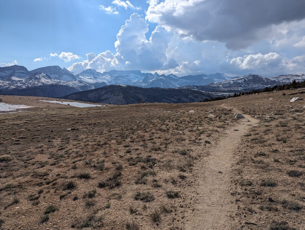 Mittlerweile merke ich die Anstrengung des Tages ziemlich und ich werde regelrecht erschöpft. Trotzdem laufe ich langsam weiter, da ich noch einige Meilen bis zum nächsten Campspot mit Wasser habe. Es geht durch eine Wiesenlandschaft und erneut bekomme ich einen schönen Blick auf die Berge der Umgebung.