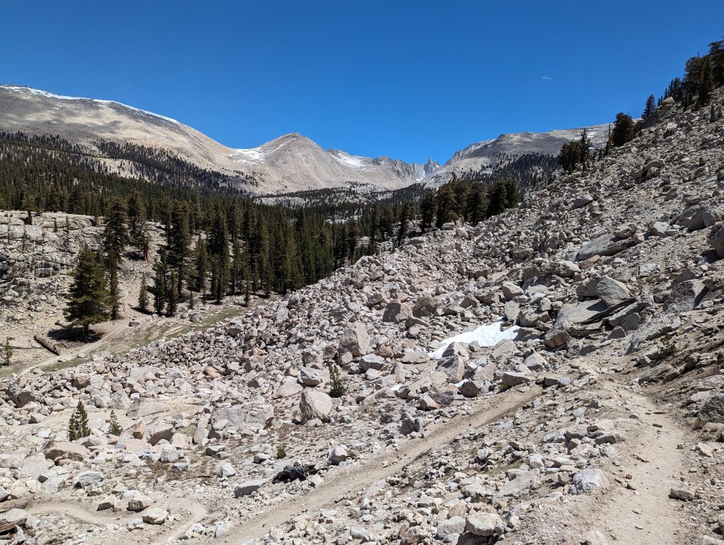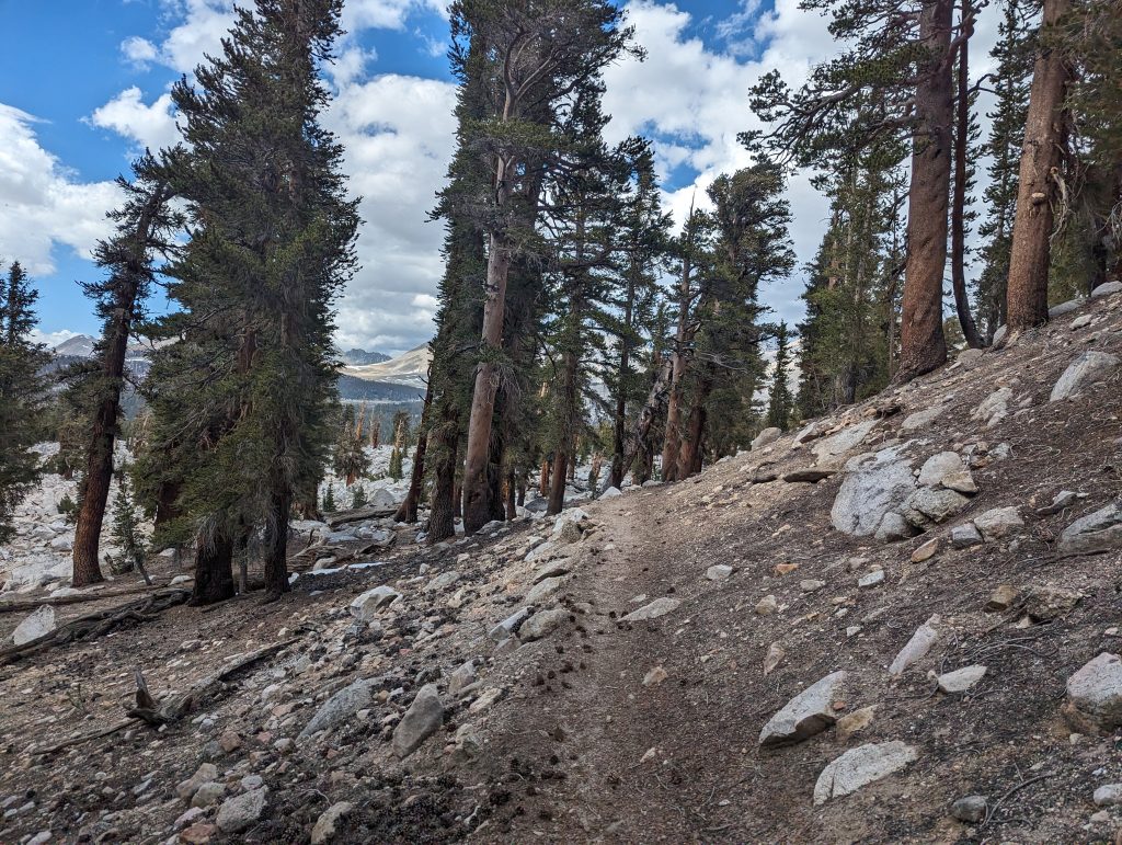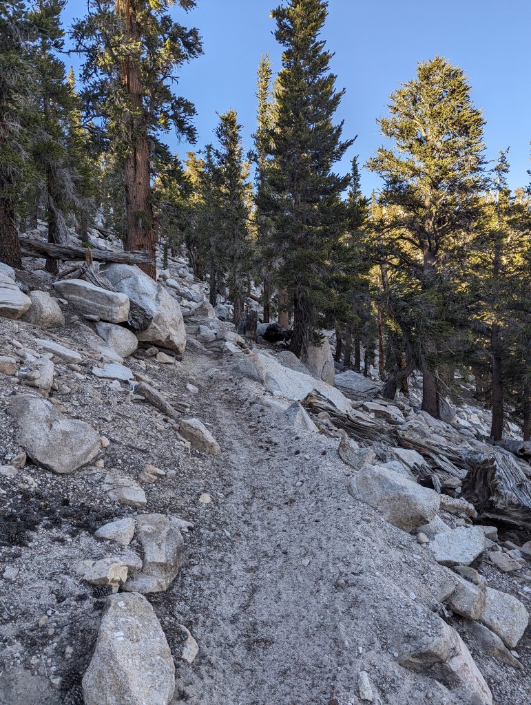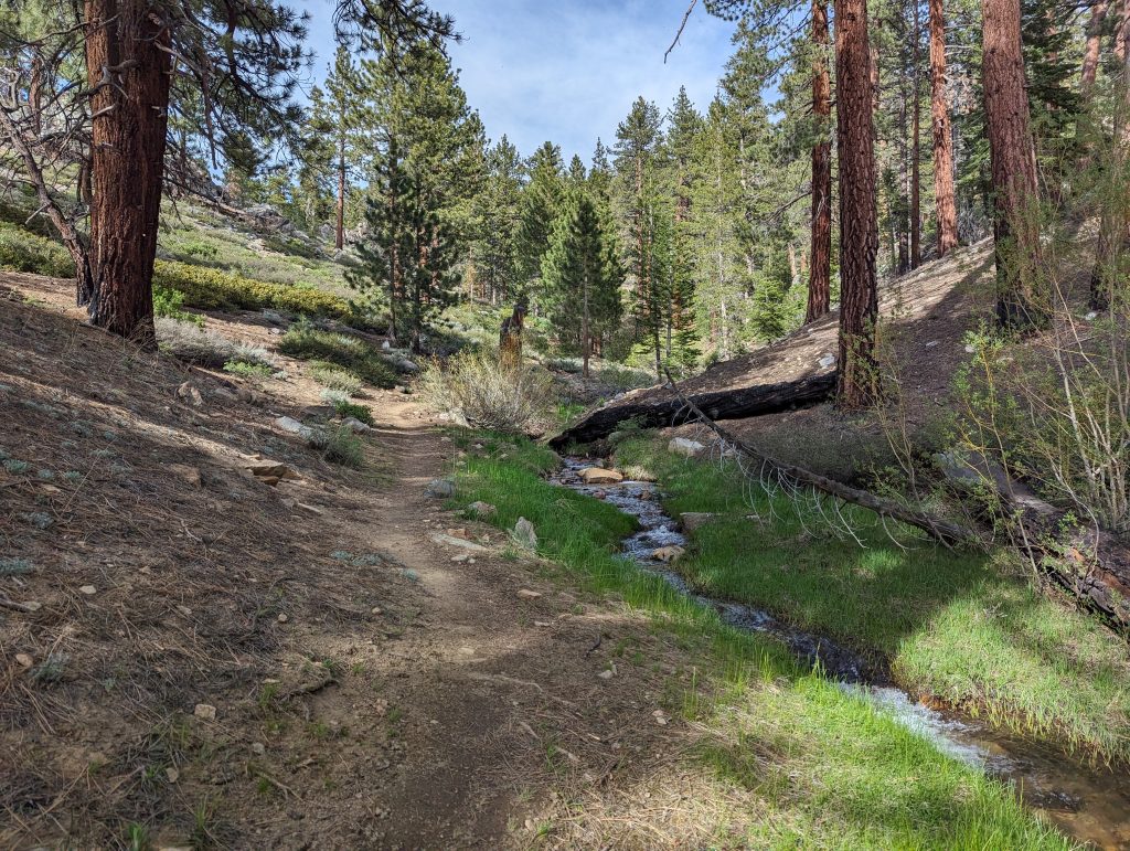 Gegen 14 Uhr packe ich alles zusammen und verlasse den Campspot. Am kleinen Fluss, der neben dem Camp fließt, treffe ich zwei Hiker, die ich bereits häufiger getroffen habe und mit denen ich in Kennedy Meadows zusammen gesessen bin. Sie fragen mich gleich, wie es auf dem Mount Whitney war und wie die Bedingungen sind. Beide sind ein Tag hinter mir und wollen morgen den Berg erklimmen. Ich beschreibe ihnen die Strecke und wie viel Zeit sie etwa einrechnen müssen. Dann tauschen wir uns noch über die weitere Strecke aus, da es dort auch einiges zu beachten gibt. Nach etwa einer halben Stunde mache ich mich dann wirklich auf den Weg.