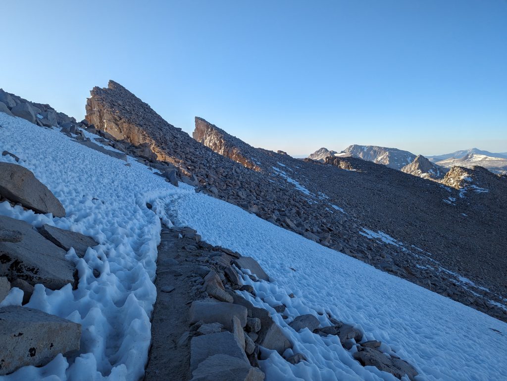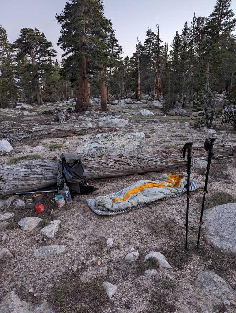Im Camp esse ich ein richtiges Frühstück, wasche einige Kleider und lege mich danach nochmals fur längere Zeit schlafen. Später schreibe ich mein Tagbuch und ruhe mich noch etwas aus. Da mit dem Forrester Pass, dem höchsten offiziellen Punkt des PCTs, aber ein weiterer anstrengender Anstieg vor mir liegt und ich diesen Morgen in der früh machen möchte, um den gefrorenen Schnee auszunutzen, geht es für mich am Nachmittag nochmals weiter.