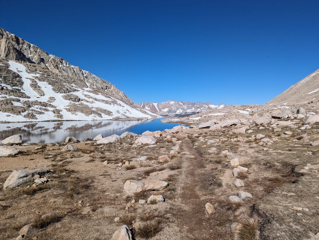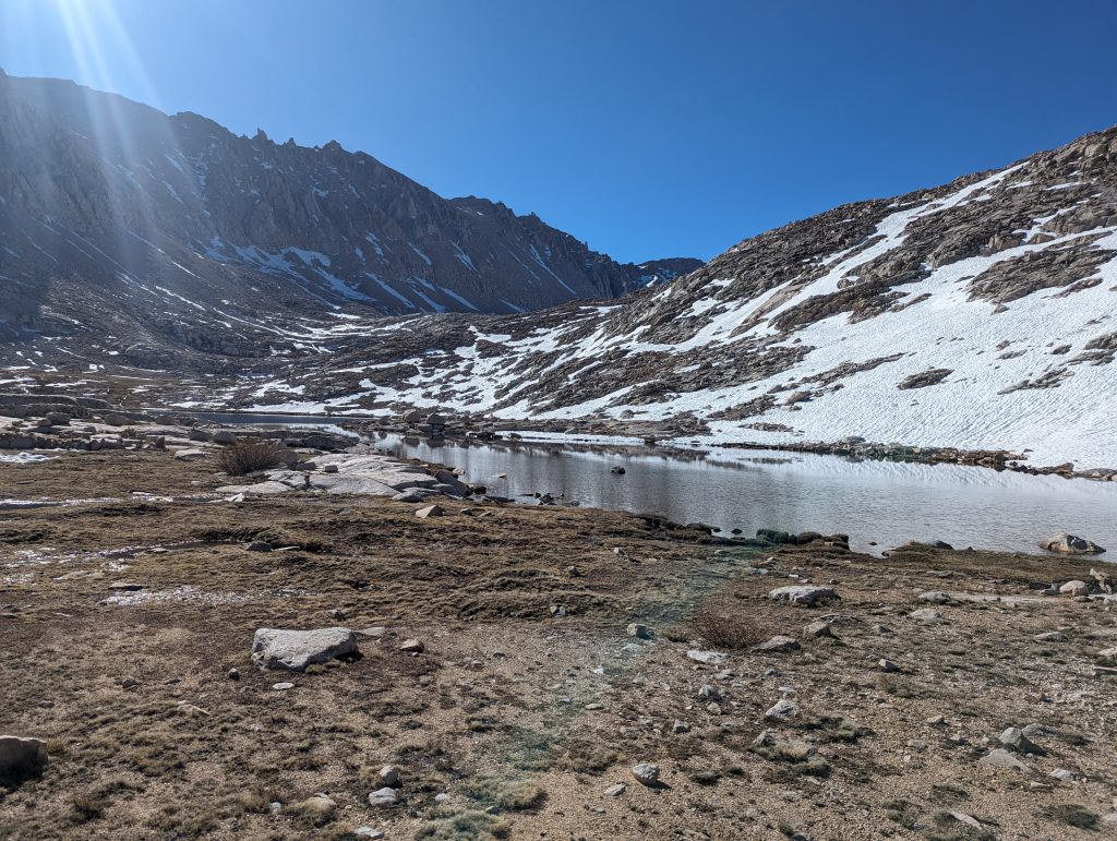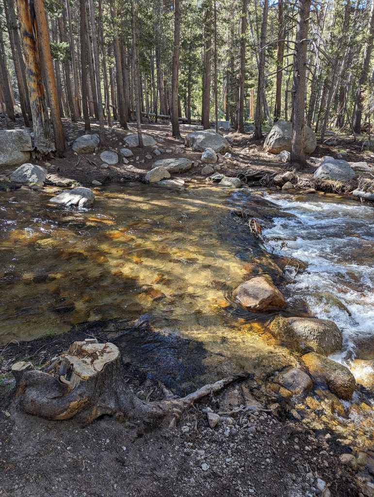 Die letzten Meter geht es entspannt am Wasser entlang, ehe ich gegen 12 Uhr das angepeilte Camp erreiche. Hier baue ich mein Zelt auf und ruhe mich aus. Bei anderen Hikern, die bereits heute den Mount Whitney bestiegen haben, informiere ich mich wie lange der Aufstieg dauert. Um 6 Uhr Abends lege ich mich schlafen, da es für mich heute Nacht bereits wieder los geht.