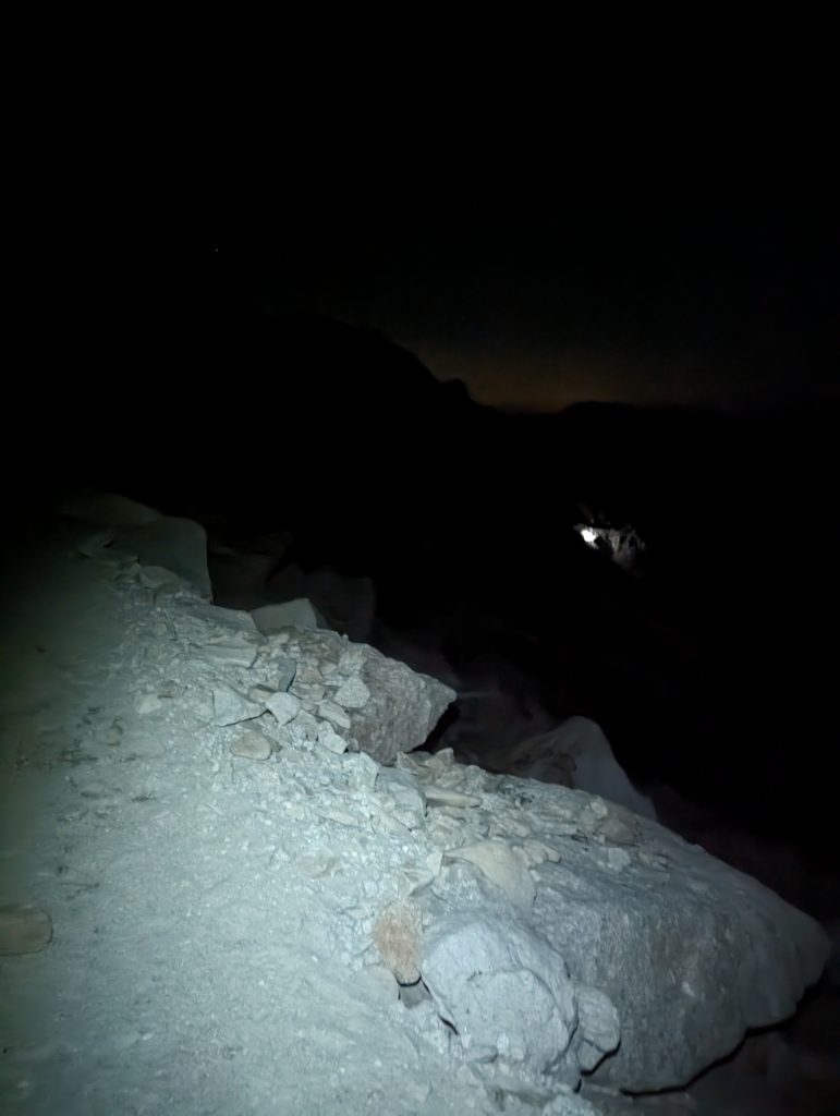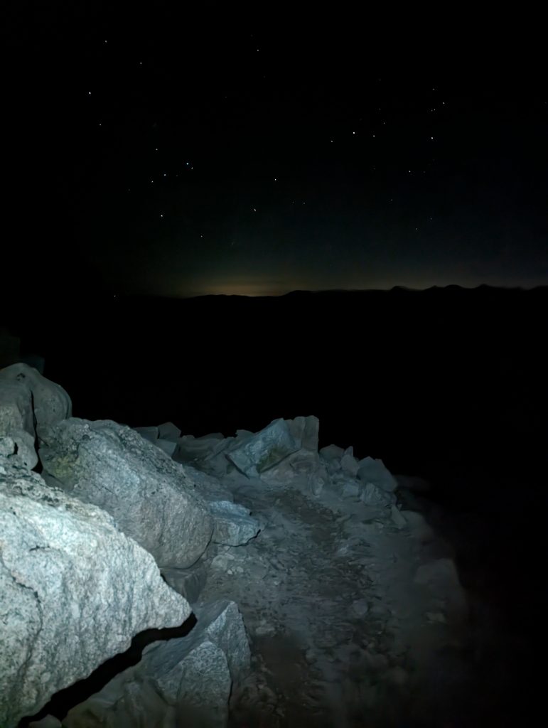 Es ist wärmer als erwartet und somit mache ich mich in kurzer Hose und Stirnlampe auf den Weg. Noch auf dem Weg aus dem Camp heraus, treffe ich einen anderen Hiker, mit dem ich die ersten Stunden zusammen laufe. Nachdem wir eine Fluss überquert haben, geht es in der Dunkelheit weiter nach hinten im Tal. Da wir außerhalb der Reichweite der Stirnlampe nicht viel sehen können, kann ich nicht besonders viel über den Weg berichten. Es geht anfangs leicht bergauf am Wasser entlang. Dann wird es felsiger und es geht immer häufiger durch kleine Schneefelder hindurch. In den kühlen Temperaturen der Nacht, sind diese zum Glück noch zugefroren und somit könne wir einfach darüberlaufen. Zwischendrin müssen wir aber immer wieder den Weg suchen, da die Wegfindung im Dunkeln nicht so einfach ist. Auch wenn wir von der Landschaft nicht wirklich viel sehen können, macht das Wandern richtig Spaß.