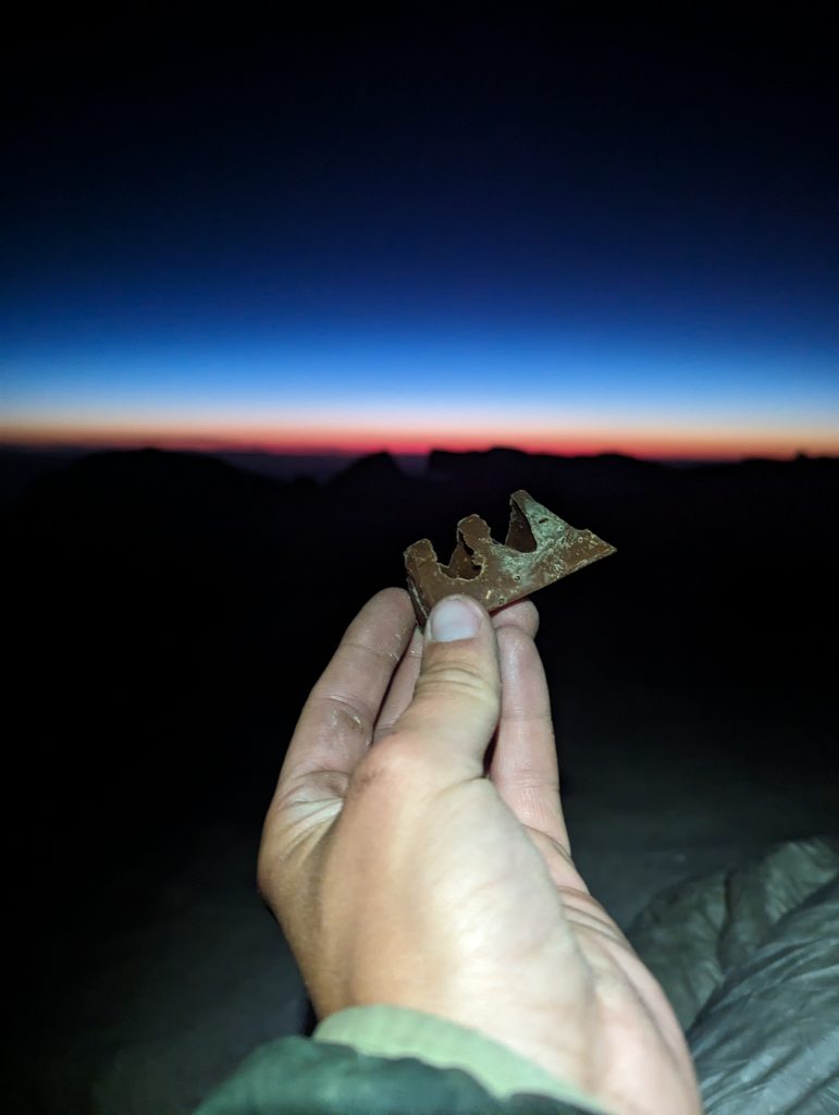 Da es gerade erst 4:20 ist, muss ich für den Sonnenaufgang noch etwas warten und kann auch sonst nicht besonders viel sehen. Lediglich ein kleines Licht am Horizont, zeigt mir wo die Sonne langsam empor steigt. Ich setzte mich an einem windgeschützten Platz hin und decke mich mit meinem Schlafsack zu. Dann gönne ich mir als Gipfelpreis ein Stück Toblerone, welche ich wirklich genieße.