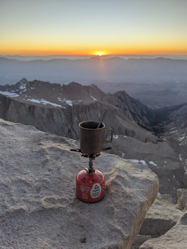 Einer der Hiker findet in seinem Rucksack noch eine kleine Flasche Whisky und somit stoßen wir um halb 6 Uhr morgens noch gemeinsam auf den Gipfel an. Während sich die anderen um 6 Uhr wieder an den Abstieg machen, schaue ich mir die Landschaft noch für einige Minuten in Ruhe an und beginne dann auch mit dem Abstieg.