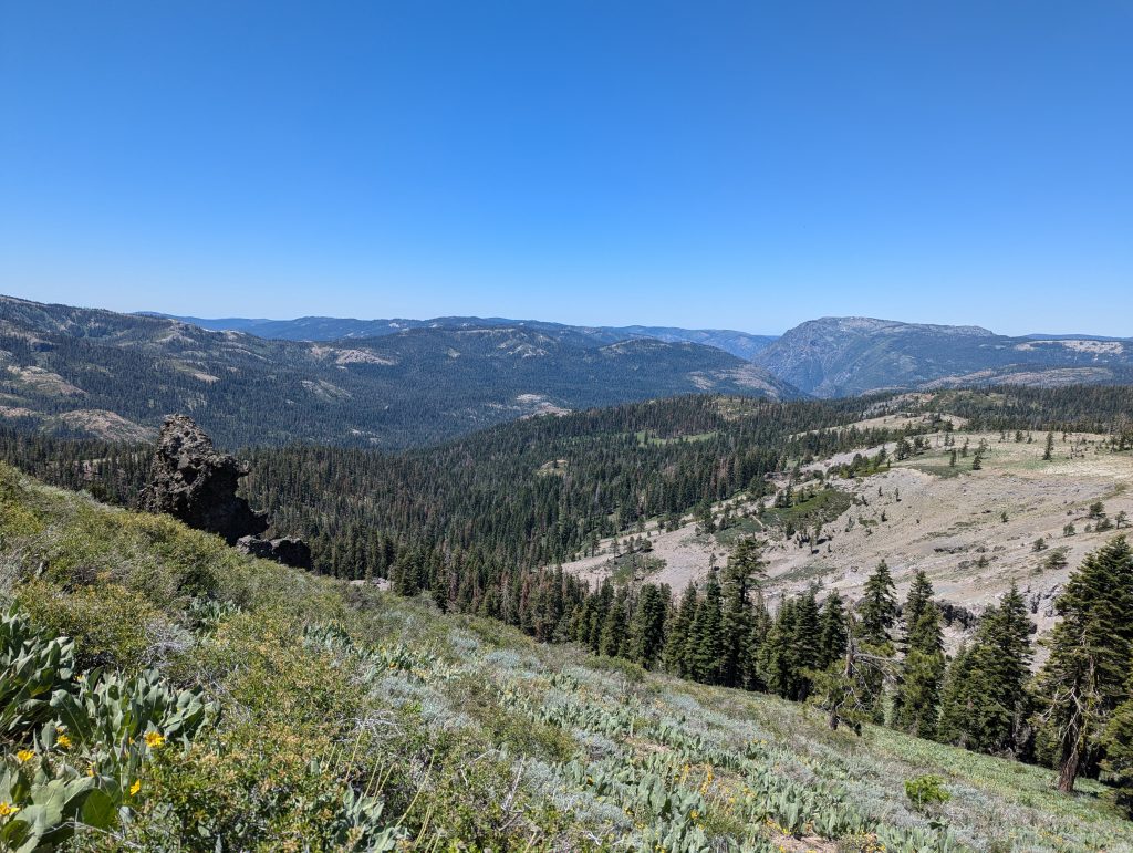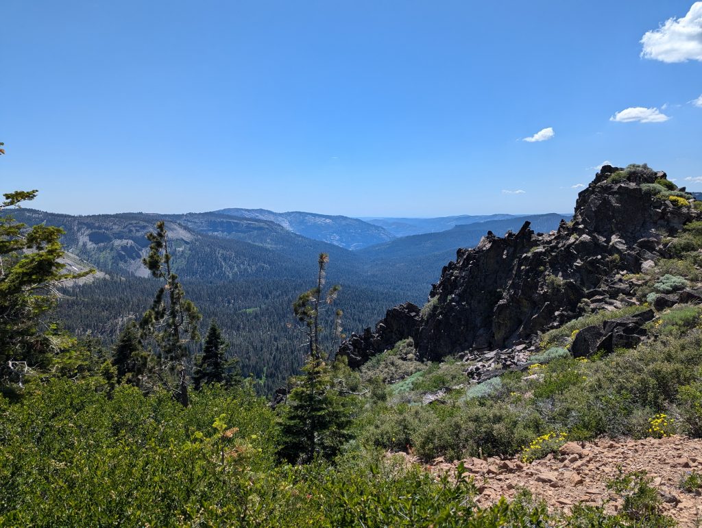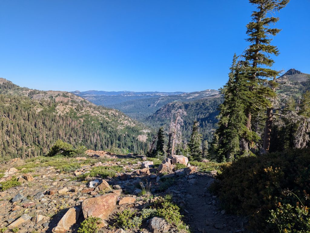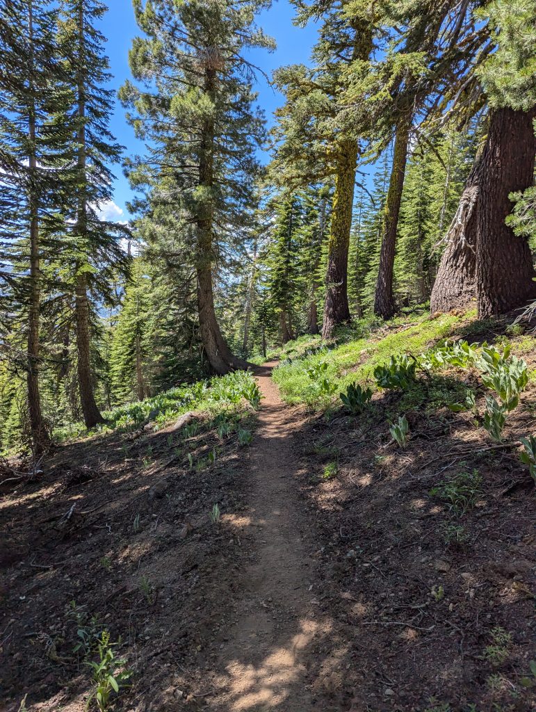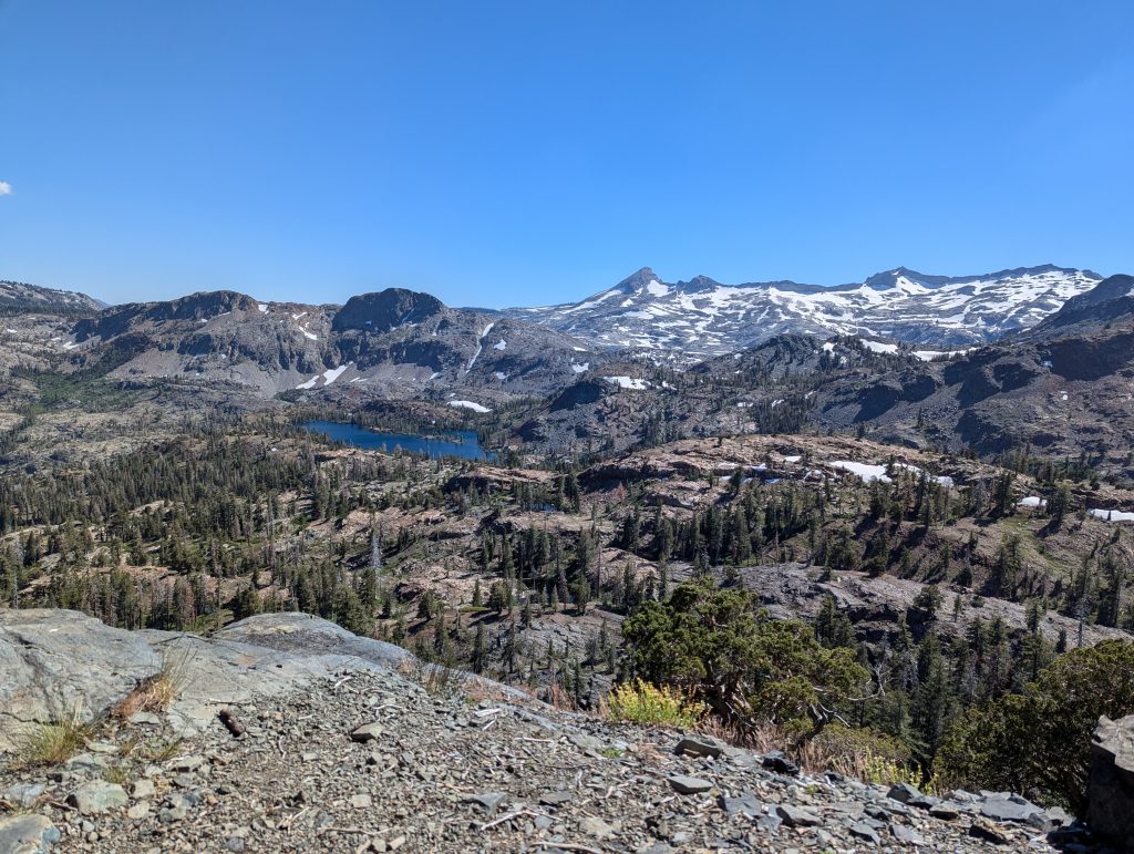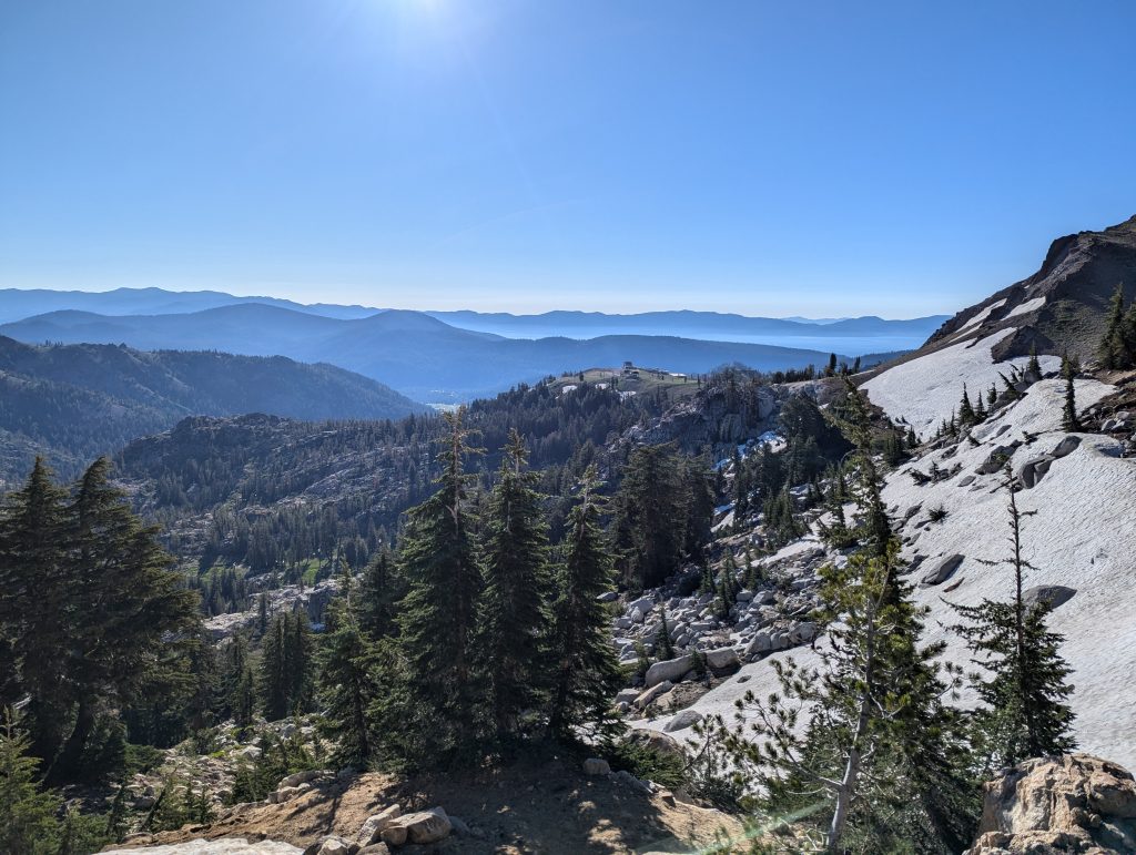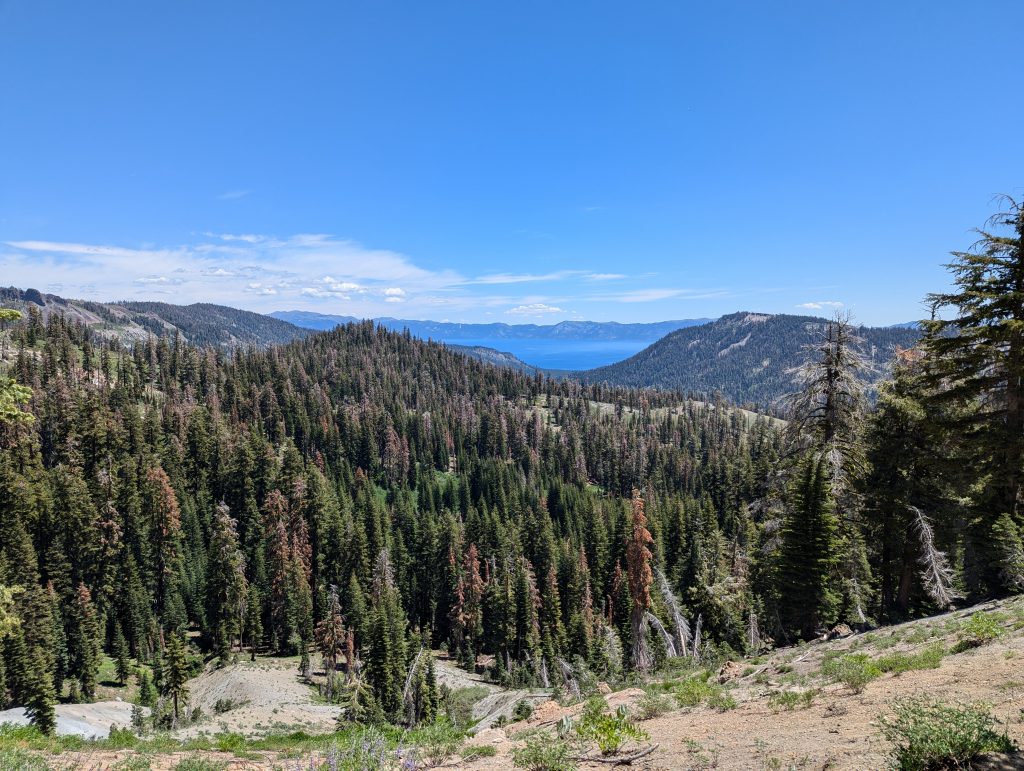 Danach geht es weiter durch den Wald auf und ab. Erst zur Mittagszeit ändert sich die Landschaft allmählich. Es geht längere Zeit einen Berg hinauf und ich bekomme einen guten Blick auf den Lake Tahoe. Danach geht es immer weiter nach oben, wobei die Serpentinen auch hier wieder sehr langezogen erscheinen. Teilweise laufe ich gefühlt eine Meile nach links und danach wieder eine Meile nach rechts immer weiter den Berg hinauf.