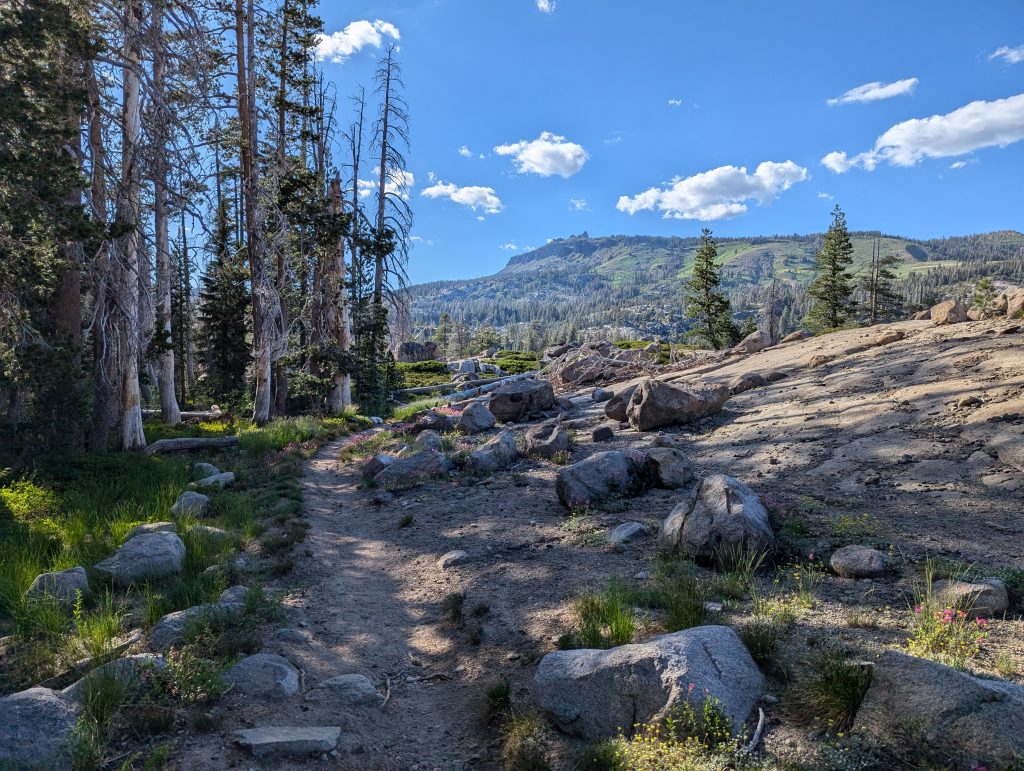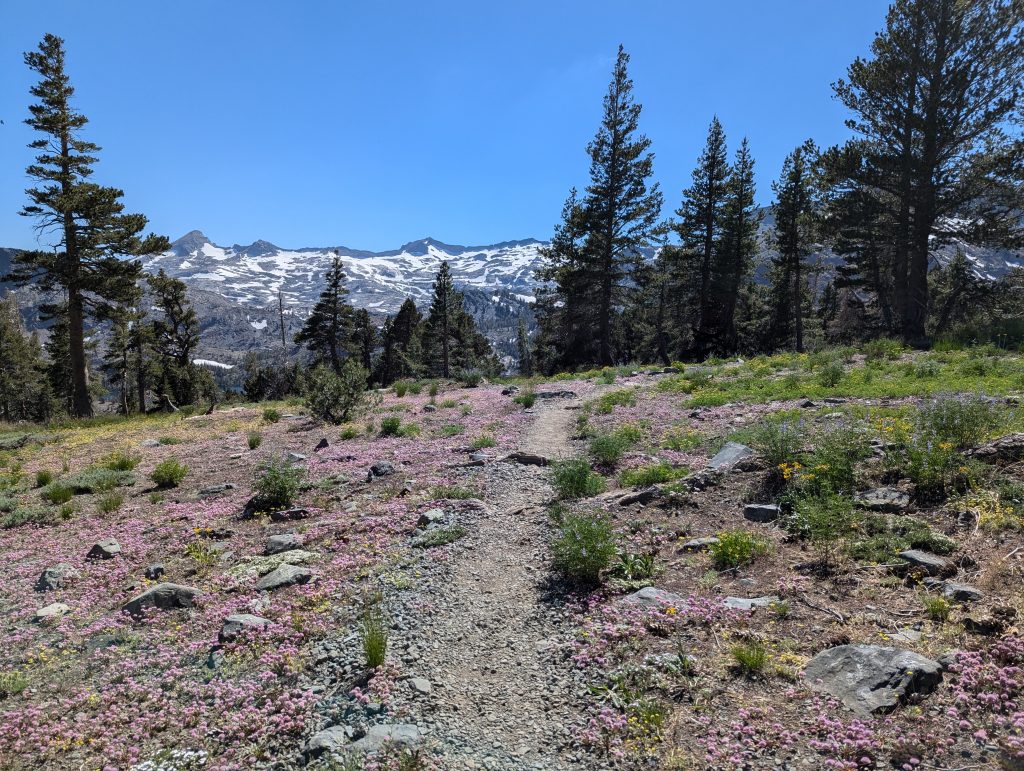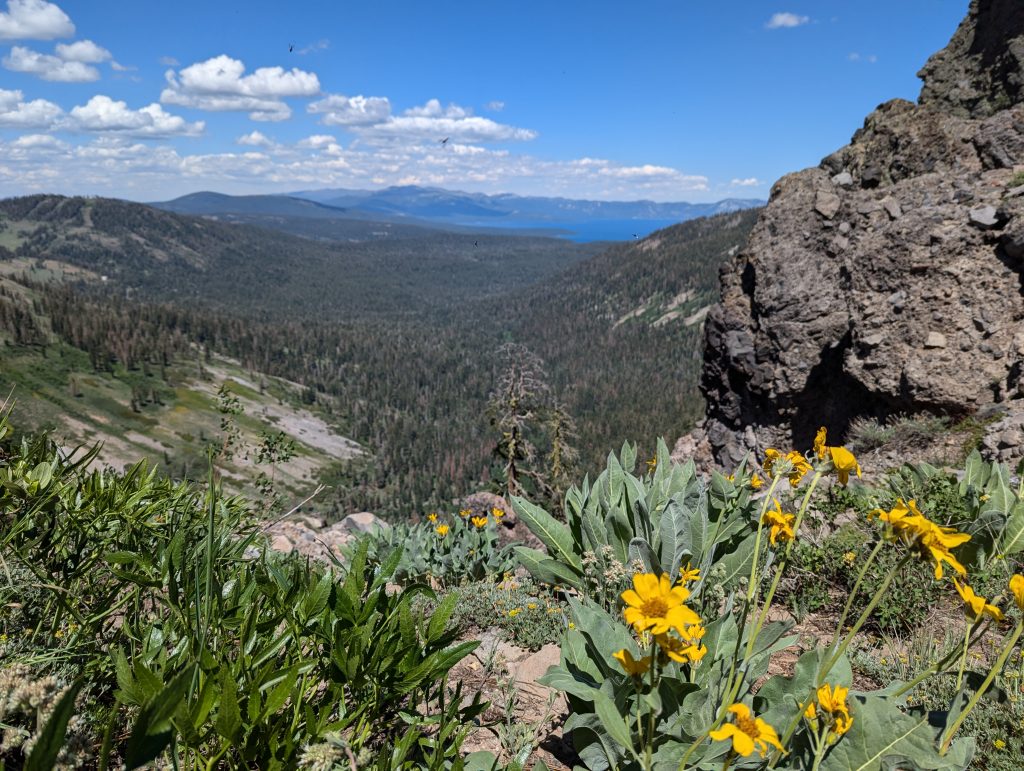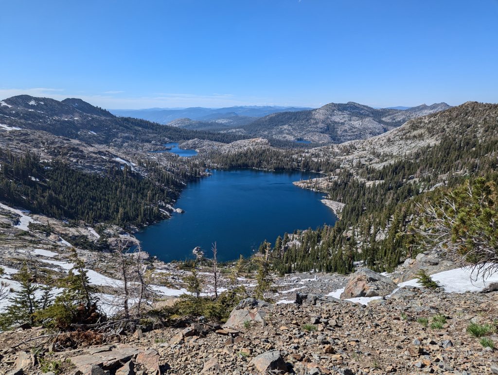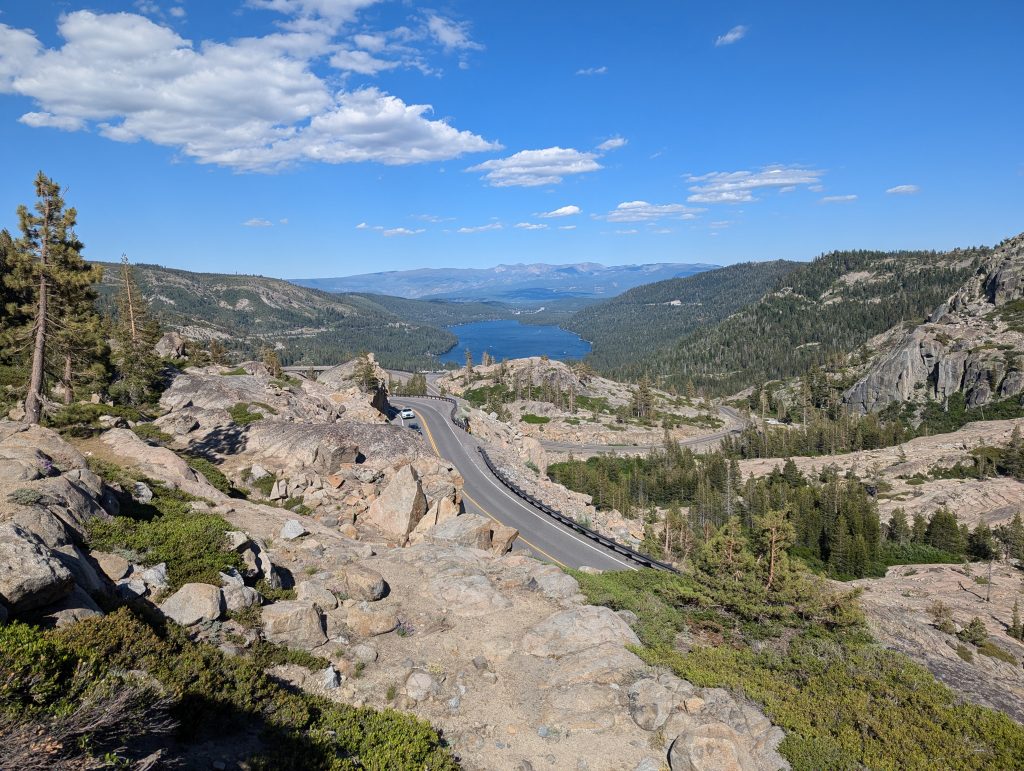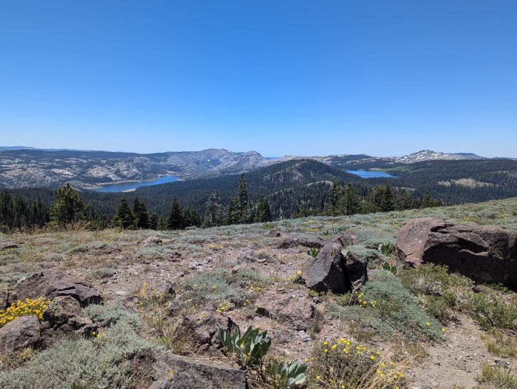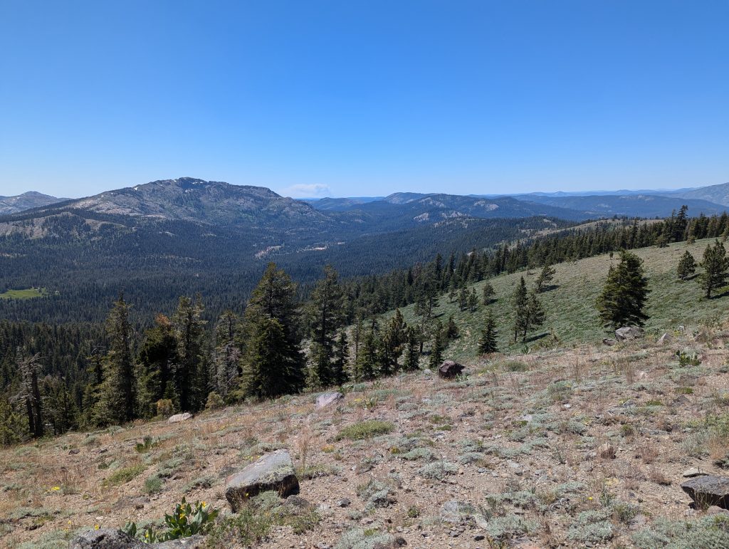 Danach geht es weiter durch den Wald auf und ab. Erst zur Mittagszeit ändert sich die Landschaft allmählich. Es geht längere Zeit einen Berg hinauf und ich bekomme einen guten Blick auf den Lake Tahoe. Danach geht es immer weiter nach oben, wobei die Serpentinen auch hier wieder sehr langezogen erscheinen. Teilweise laufe ich gefühlt eine Meile nach links und danach wieder eine Meile nach rechts immer weiter den Berg hinauf.