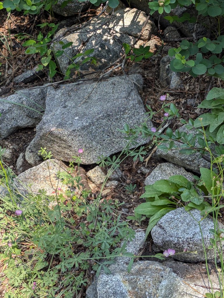 Immerhin komme ich am Morgen gut voran und laufe mal wieder mit mehr als 5,5 km/h durch die Gegend und das sowohl bergauf, als auch bergab. Die meiste Zeit passiert relativ wenig und somit laufe ich entspannt durch die Gegend. Nachdem ich eine längere Zeit bergab gelaufen bin, höre ich auf einmal ein Klappern neben mir. Als ich mich umdrehe, kann ich tatsächlich eine kleine Klapperschlange zwischen den Steinen neben dem Weg sehen. Da ich hier nicht mit einem dieser Exemplare gerechnet hatte, bin ich doch etwas erschrocken. Aber immerhin kann ich meinen Klapperschlangen-Counter wieder um eins erhöhen.