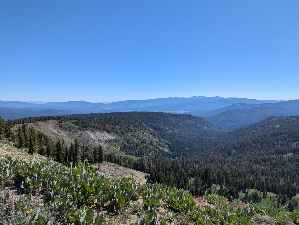 Danach geht es weiter immer weiter bergauf und ich laufe lange Zeit durch Blumen hindurch. Die Aussicht ist heute fast den ganzen Tag gut und ich kann viel Wald vor und hinter mir erblicken.