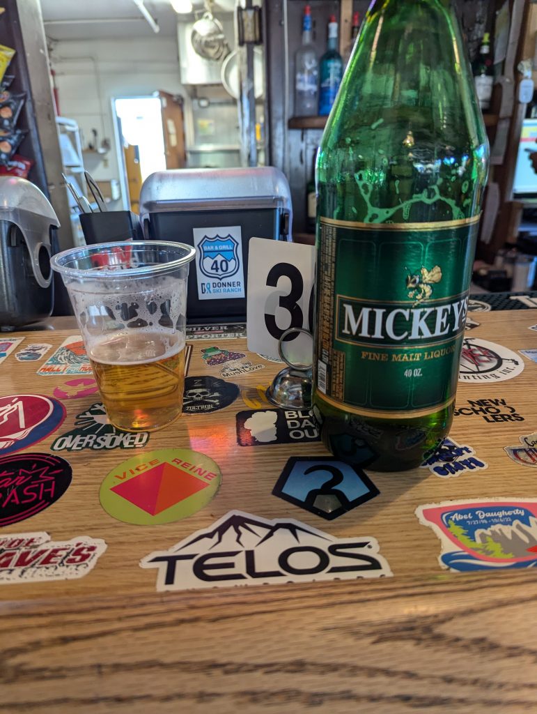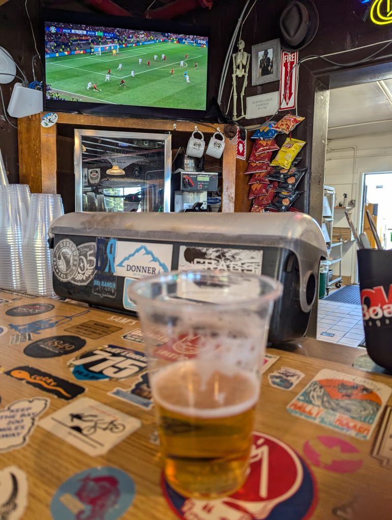 Gegen halb 2 komme ich dann tatsächlich am Ski Resort an. Dort treffe ich direkt andere PCT-Hiker und setzte mich zu einem bekannten Hiker an den Tresen, der bereits dafür gesorgt hat, dass auf dem Fernseher das Europameisterschaftsspiel Portugal gegen Slowenien läuft. Ich bestelle mir einen Cheeseburger mit Pommes um bekomme gegen Vorlage meines PCT-Permits tatsächlich ein kostenloses Bier. Wobei es sich hierbei sogar um eine 40oz (1,13 Liter) Flasche handelt. Immerhin bekomme ich eins mit 5,3 Prozent und nicht wie mein Kollege 8,1 Prozent. Während wir Bier trinken und essen, schauen wir uns das Spiel an.