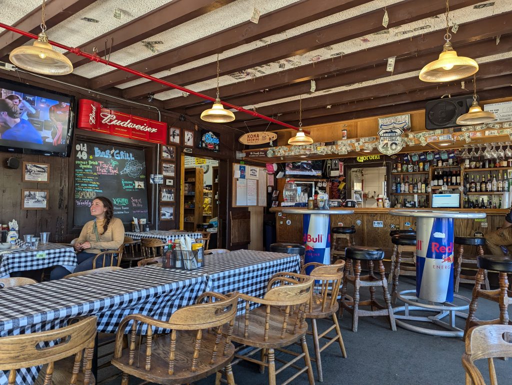 Da das mit dem Trampen auf der wenig befahrenen Straße in 10 Minuten nicht so erfolgreich war und es nur knapp 1,6 Meilen zur Ortsmitte sind, laufe ich einfach zu Fuß los. Nach einigen Metern sammelt mich dann doch jemand mit dem Auto ein und setzt mich vor dem Cafe des Ortes ab.